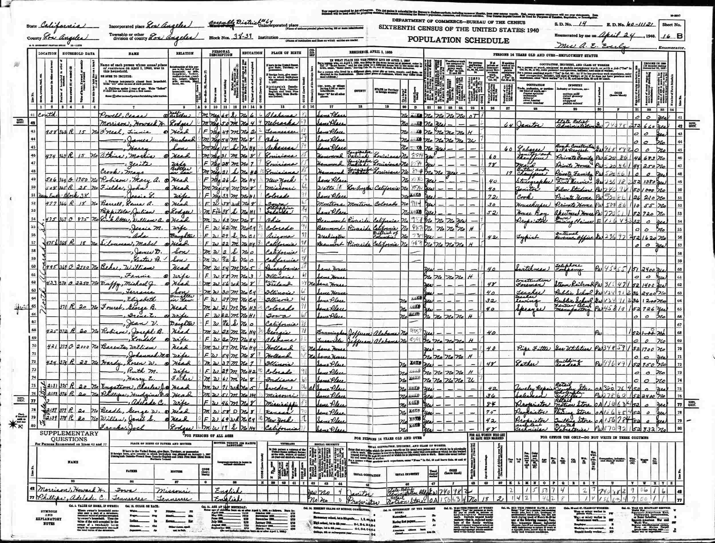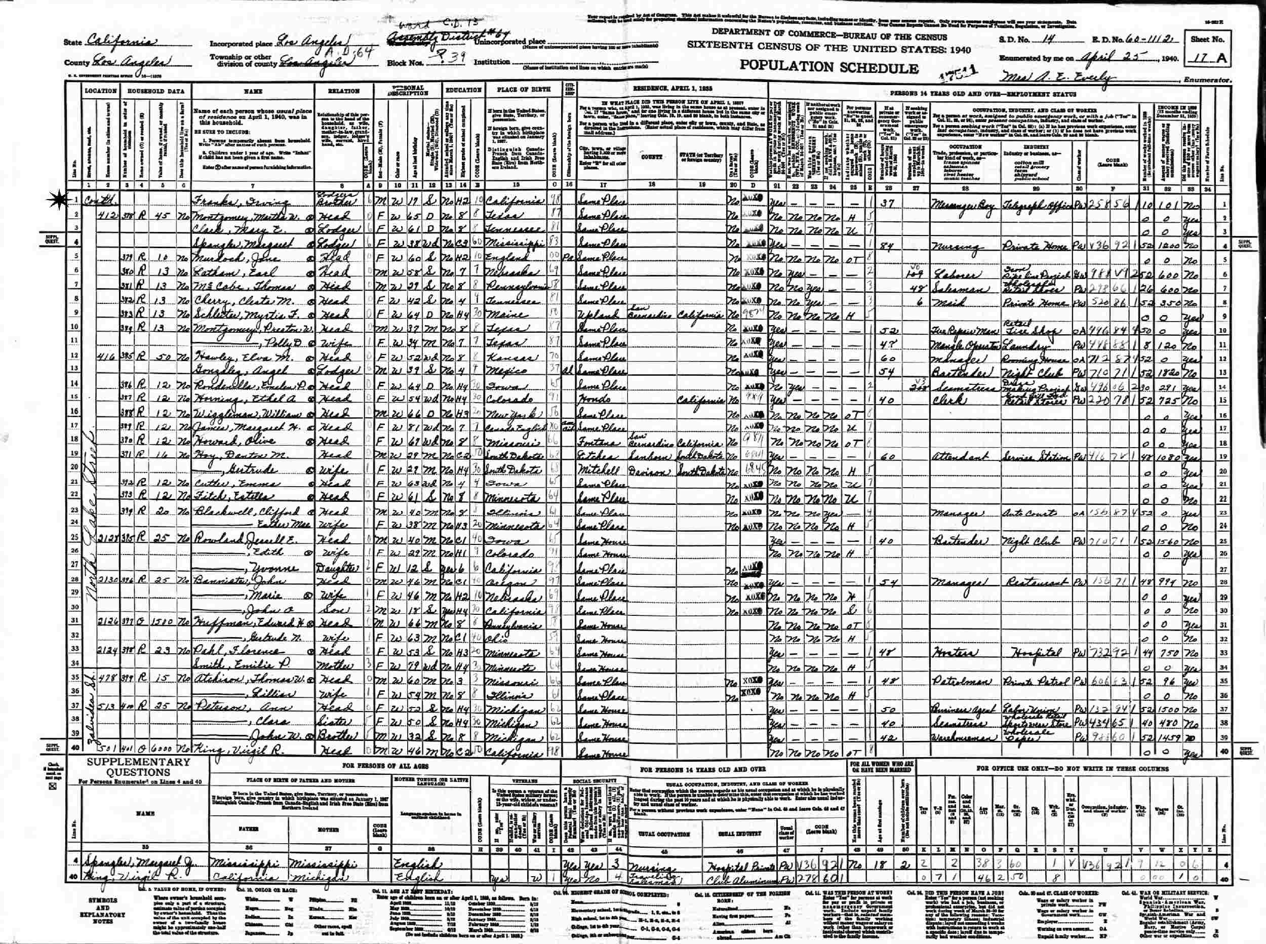 April 25, 1940 - 2139 Temple Street, Assembly District 64, Blocks 38-39, Supervisor's District 14, Enumeration District 60-1112, Los Angeles, Los Angeles County, California (Lodger w/Janet S Willan w/brother Irving).