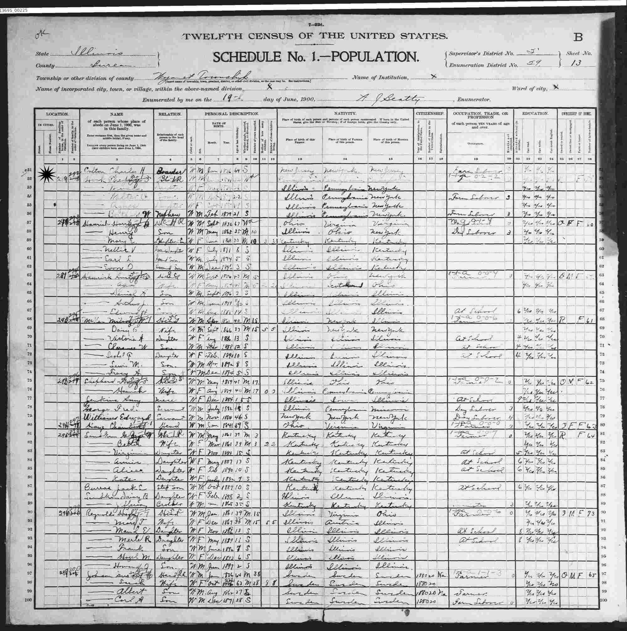 June 19, 1900 - Wyanet Village, Bureau County, Illinois. (Listed as single.)