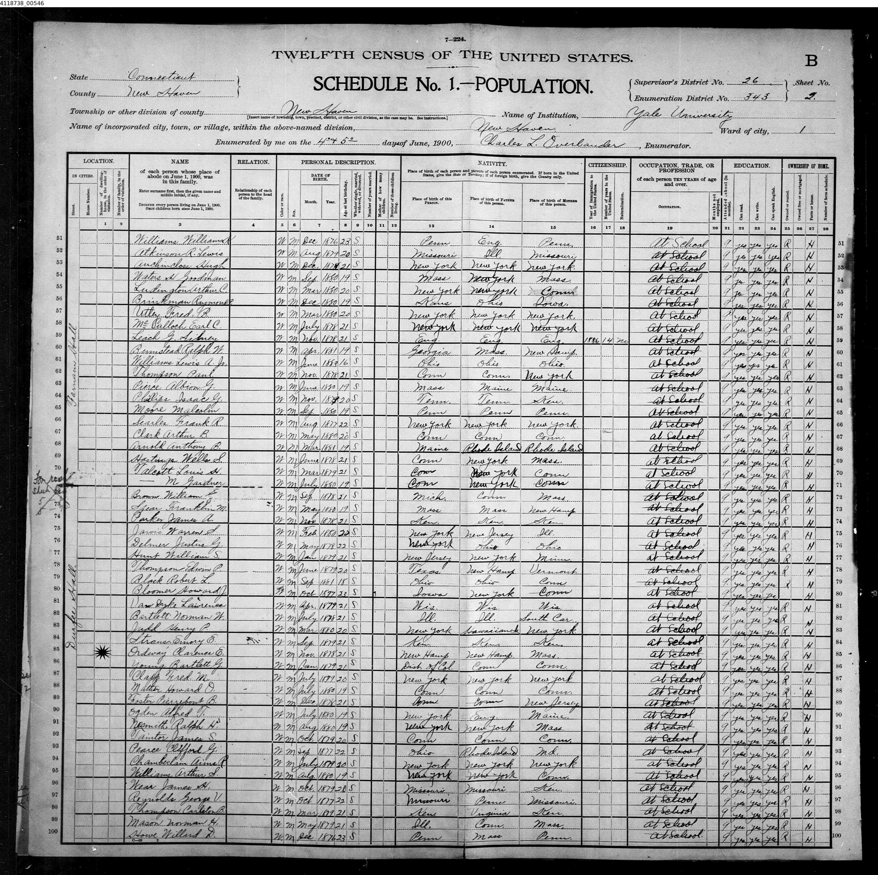 June 4-5, 1900 - ED 343 Yale University Ward 1, New Haven, Connecticut.
