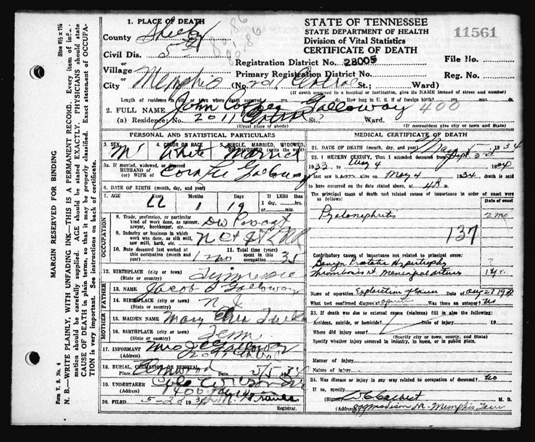 Died: May 4, 1934 in Memphis, Shelby County, Tennessee.