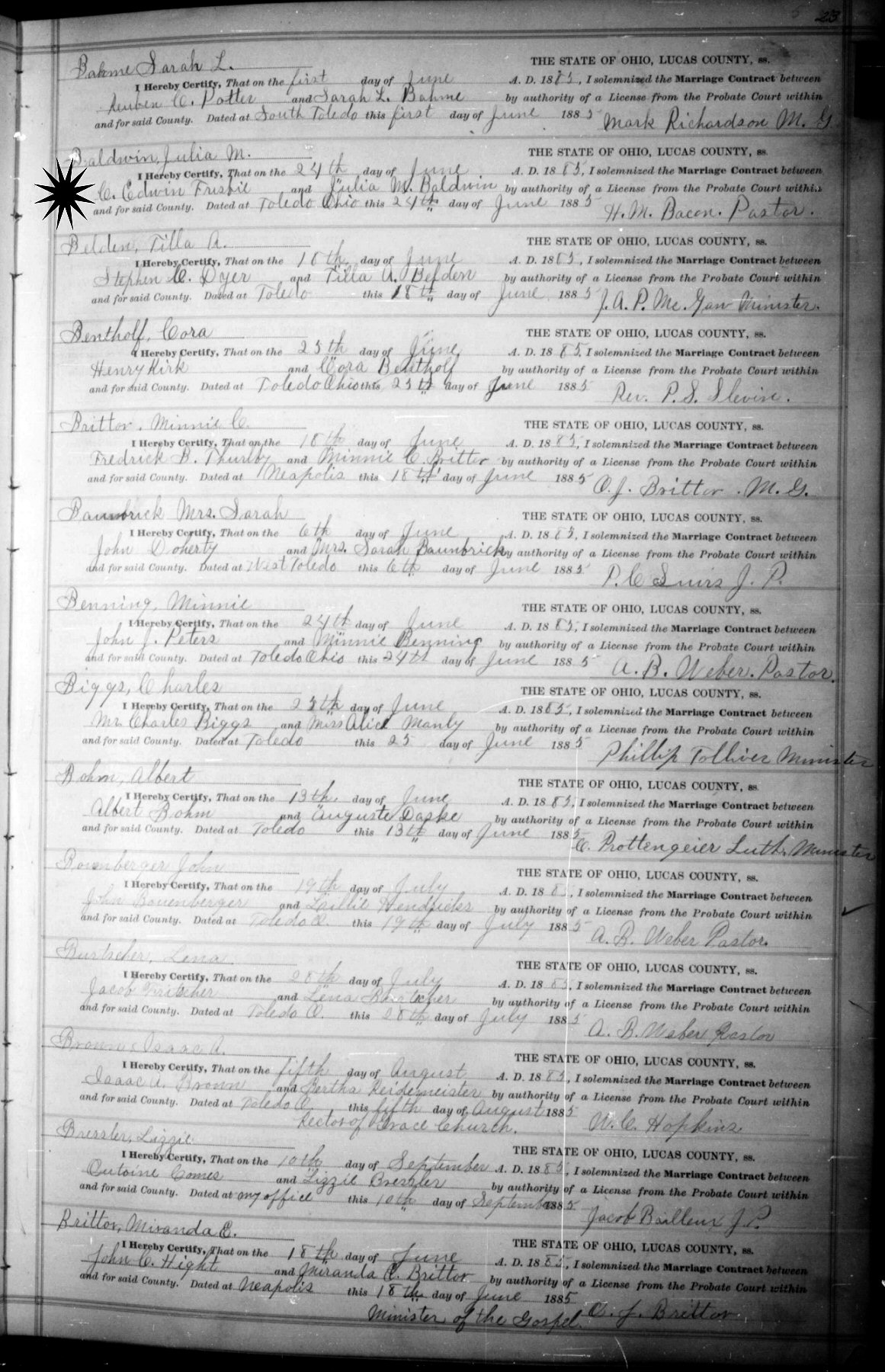 Married: Charles Edwin Frisbie June 24, 1885 in Lucas County, Ohio.
