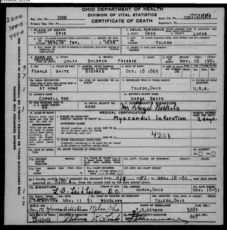 Died: November 10, 1951 in Berlin Township, Toledo, Lucas County, Ohio.