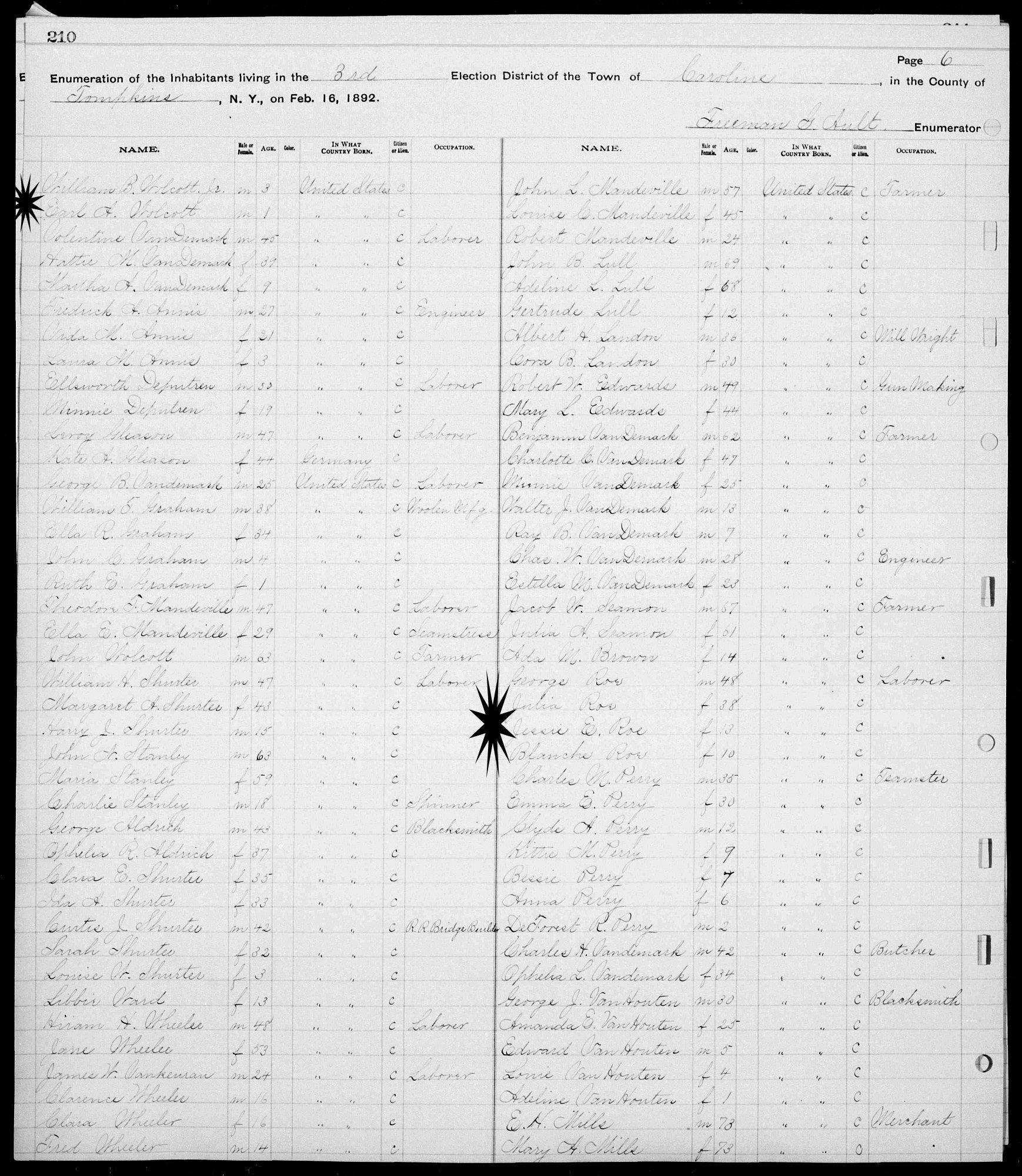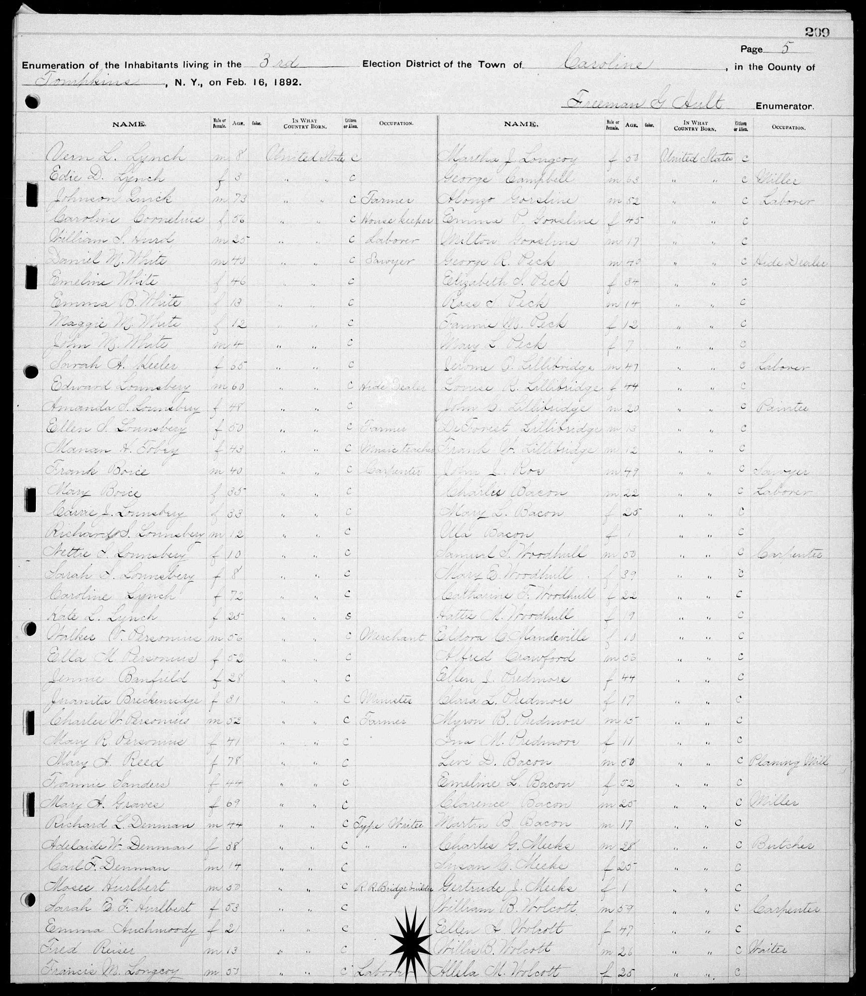 Census: February 16, 1892 - E.D. 03, Caroline, Tompkins County, New York.