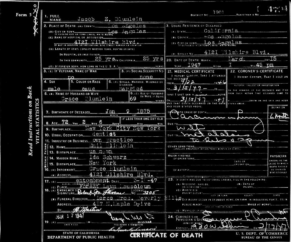 Died: March 15, 1947 in at home, Los Angeles, Los Angeles County, California.