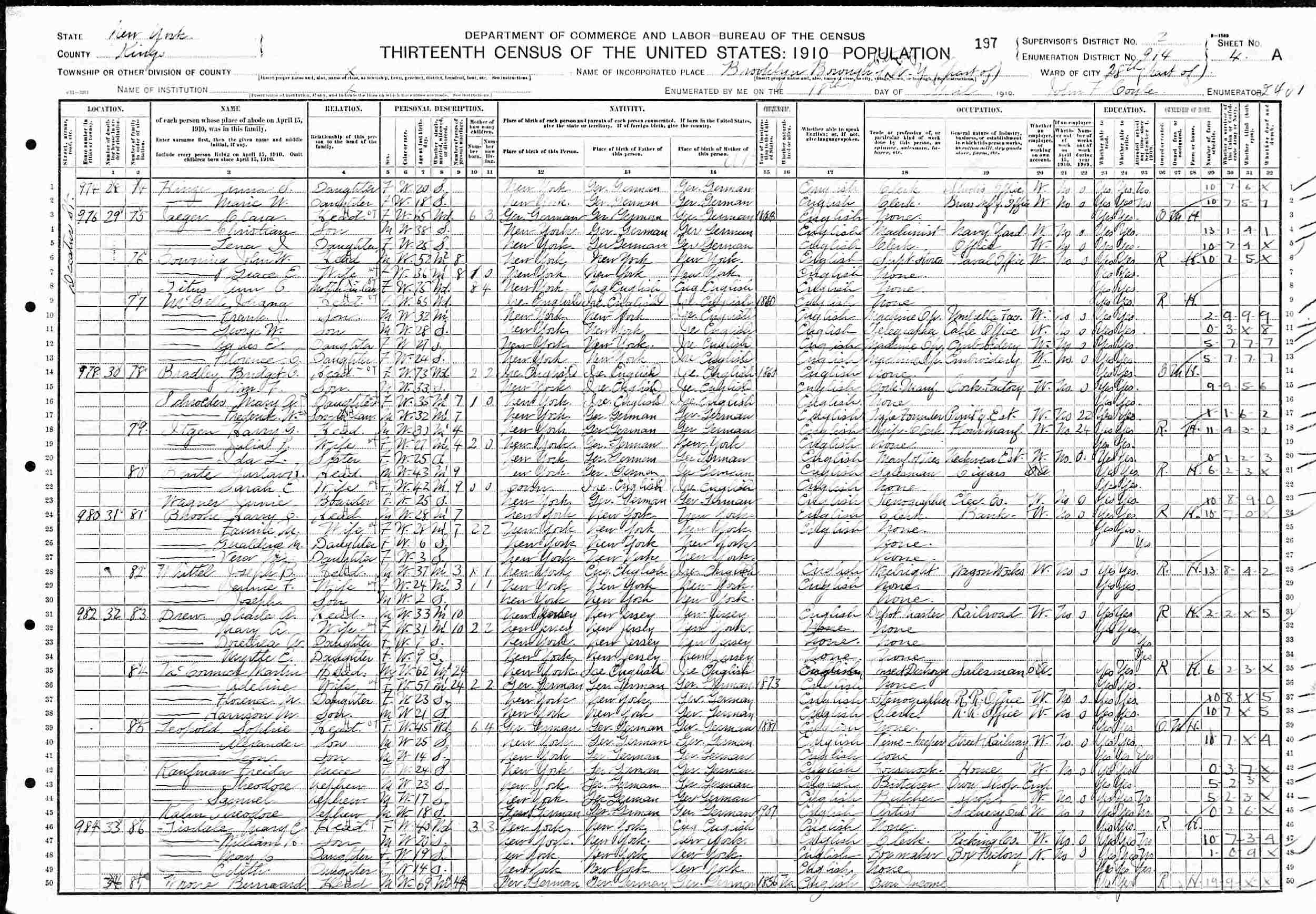 April 18, 1910 - 982 Decatur, Ward 28, Supervisor's District 2, Enumeration District 914, Brooklyn, Kings County, New York.