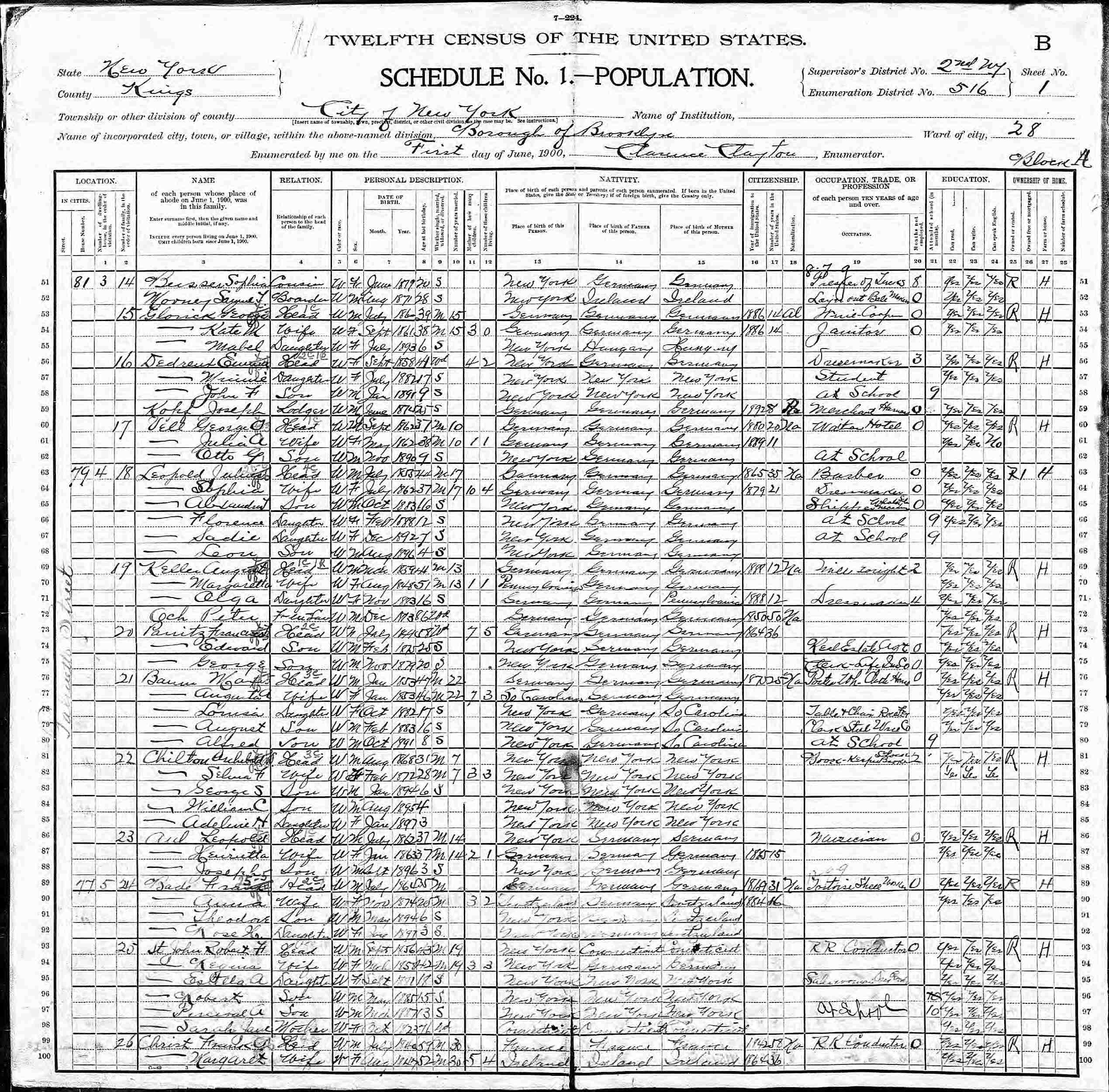 June 1, 1900 - 79 Palmetto Street, Ward 28, Supervisor's District 2, Enumeration District 516, Brooklyn, Kings County, New York.