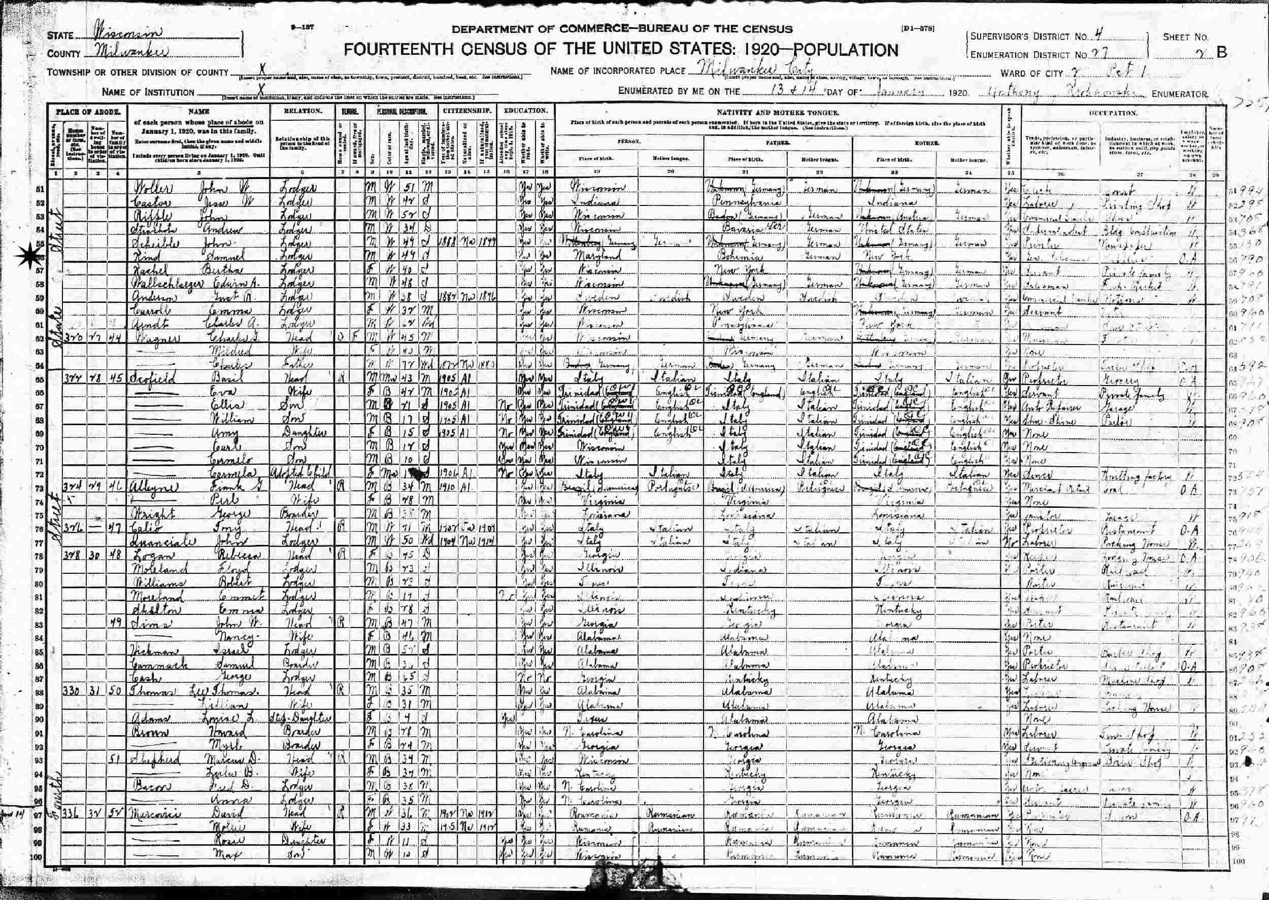 January 13-14, 1920 - 318 State Street, Precinct 1, Ward 2, Supervisor's District 4, Enumeration District 27, Milwaukee, Milwaukee County, Wisconsin (Lodger).