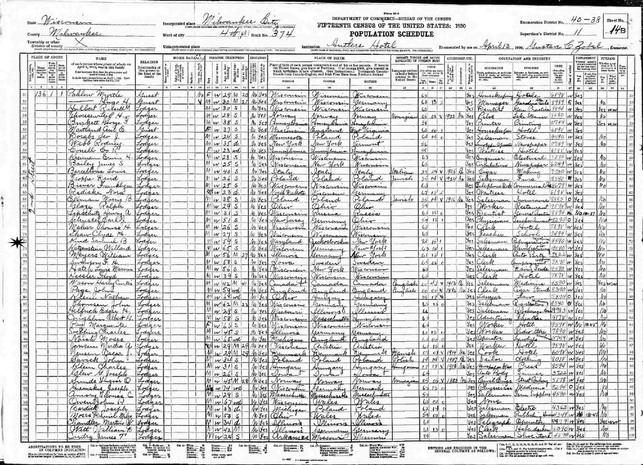 April 13, 1930 - Atlers Hotel, 136 2nd Street, Block 374, 4th Ward, Milwaukee, Milwaukee County, Wisconsin (Lodger).