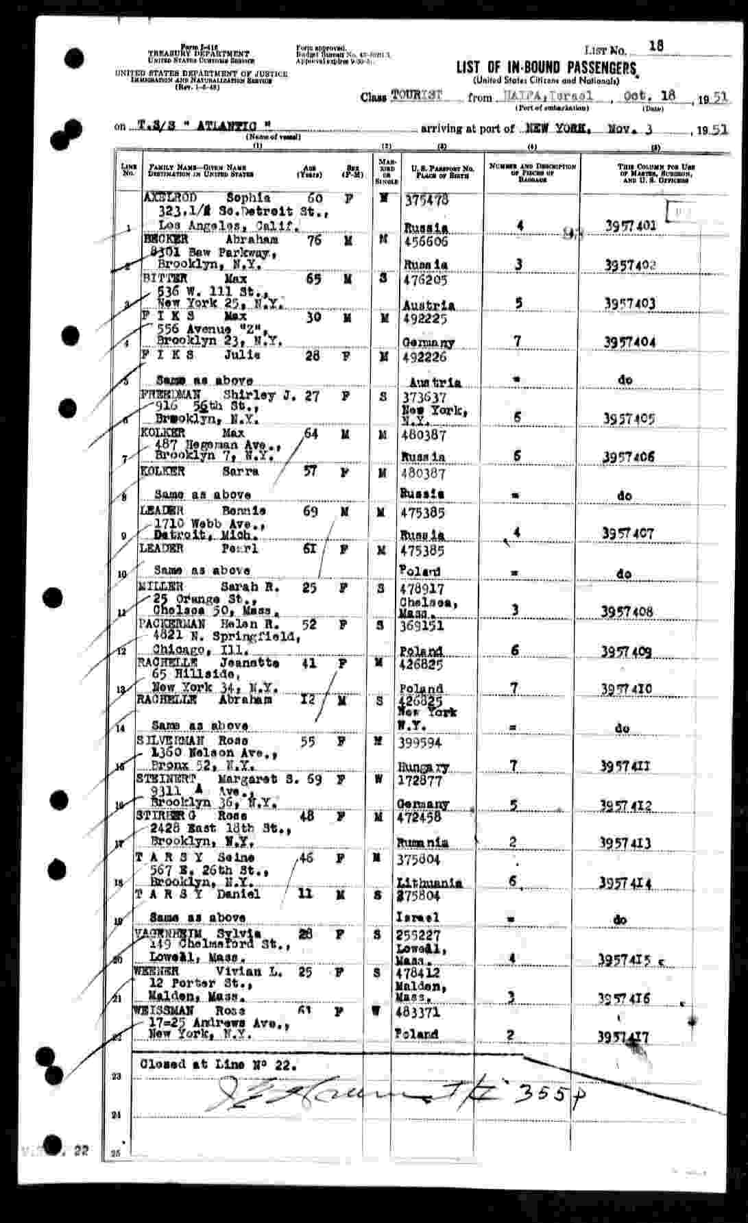 Travel - October 19, 1951-November 3, 1951 - Haifa, Israel to New York, New York. Ship: T.S/S Atlantic.