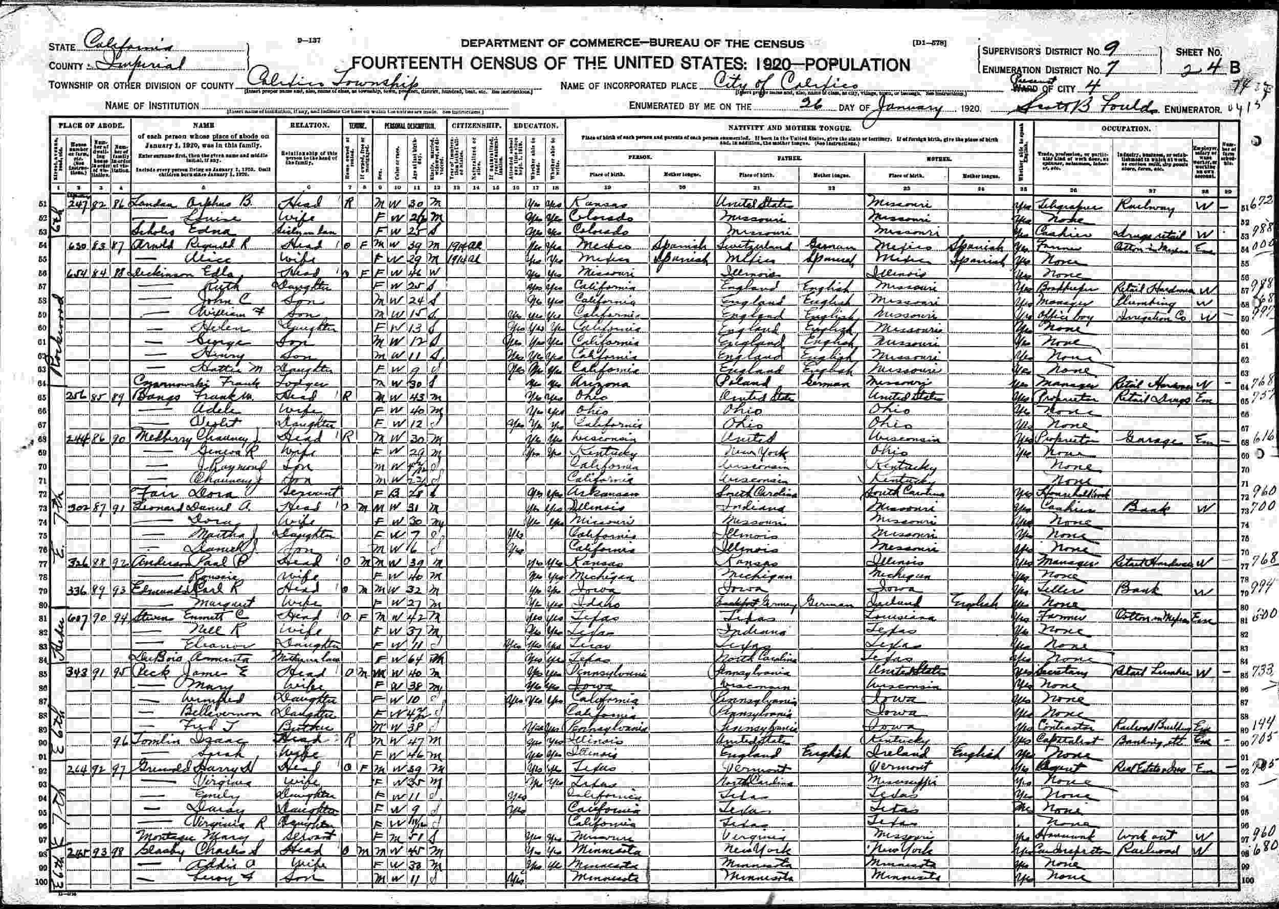 January 26, 1920 - 343 E 6th, Precinct 4, Precinct 4, Supervisor's District 9, Enumeration District 7, Calexico Township, Imperial County, California.