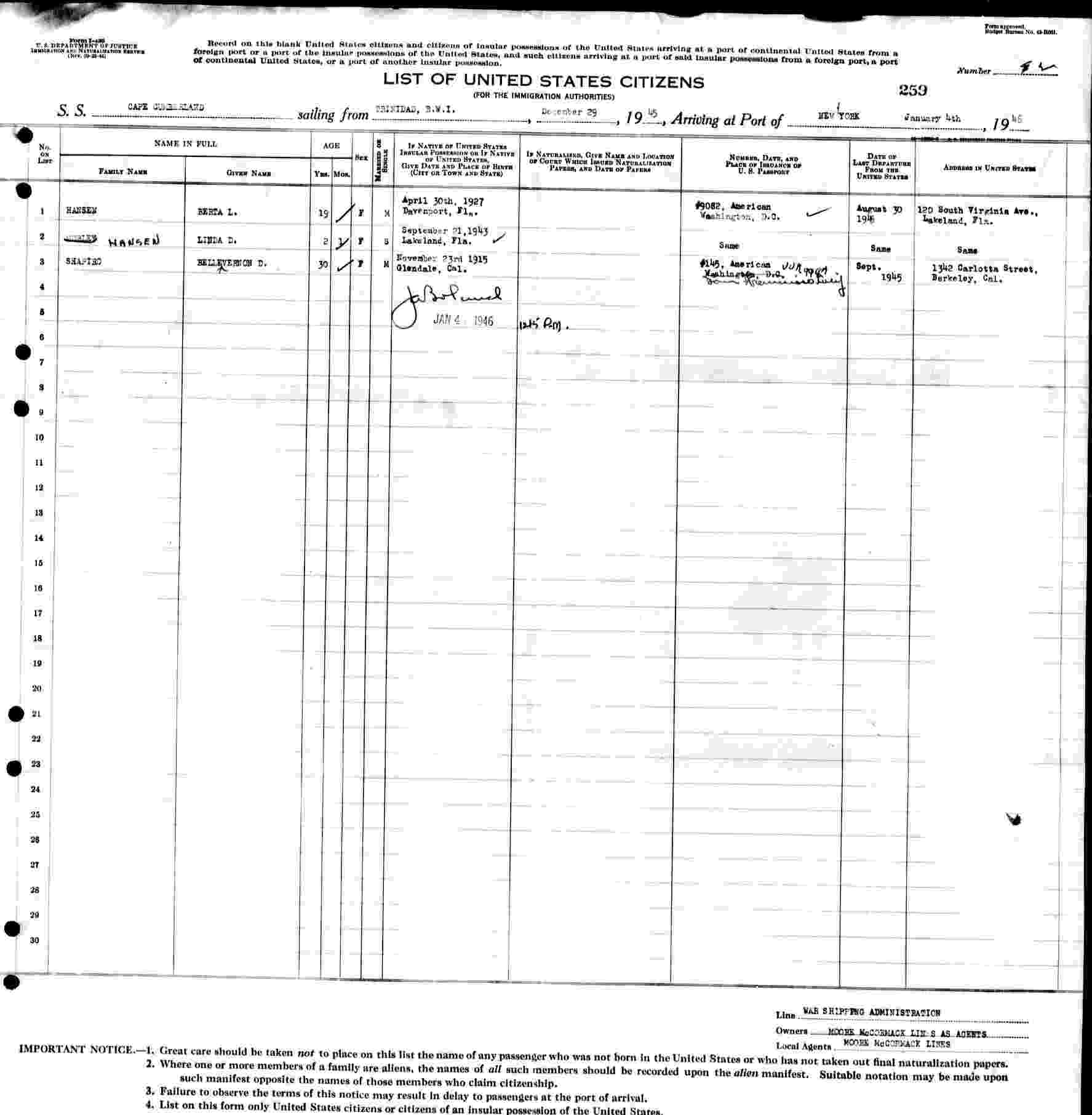 December 29, 1945-January 4, 1946 - Trinidad, B.W. I. to New York. Ship: S.S. Cape Cumberland.