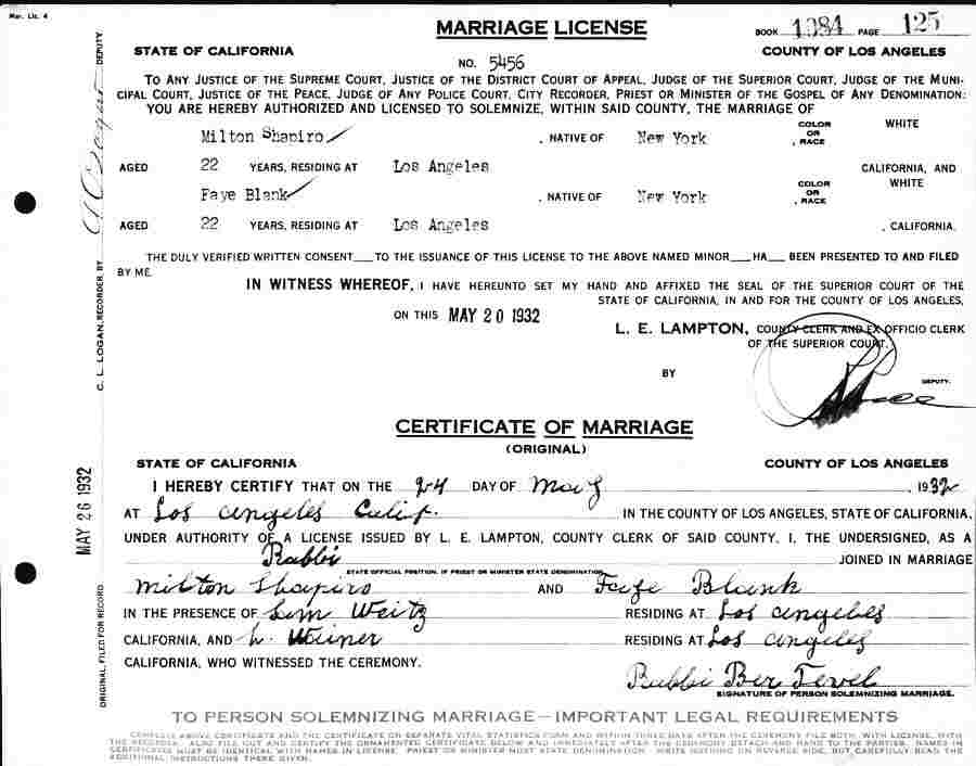 Married: (1) Milton Shapiro May 24, 1932 in Los Angeles County, California.