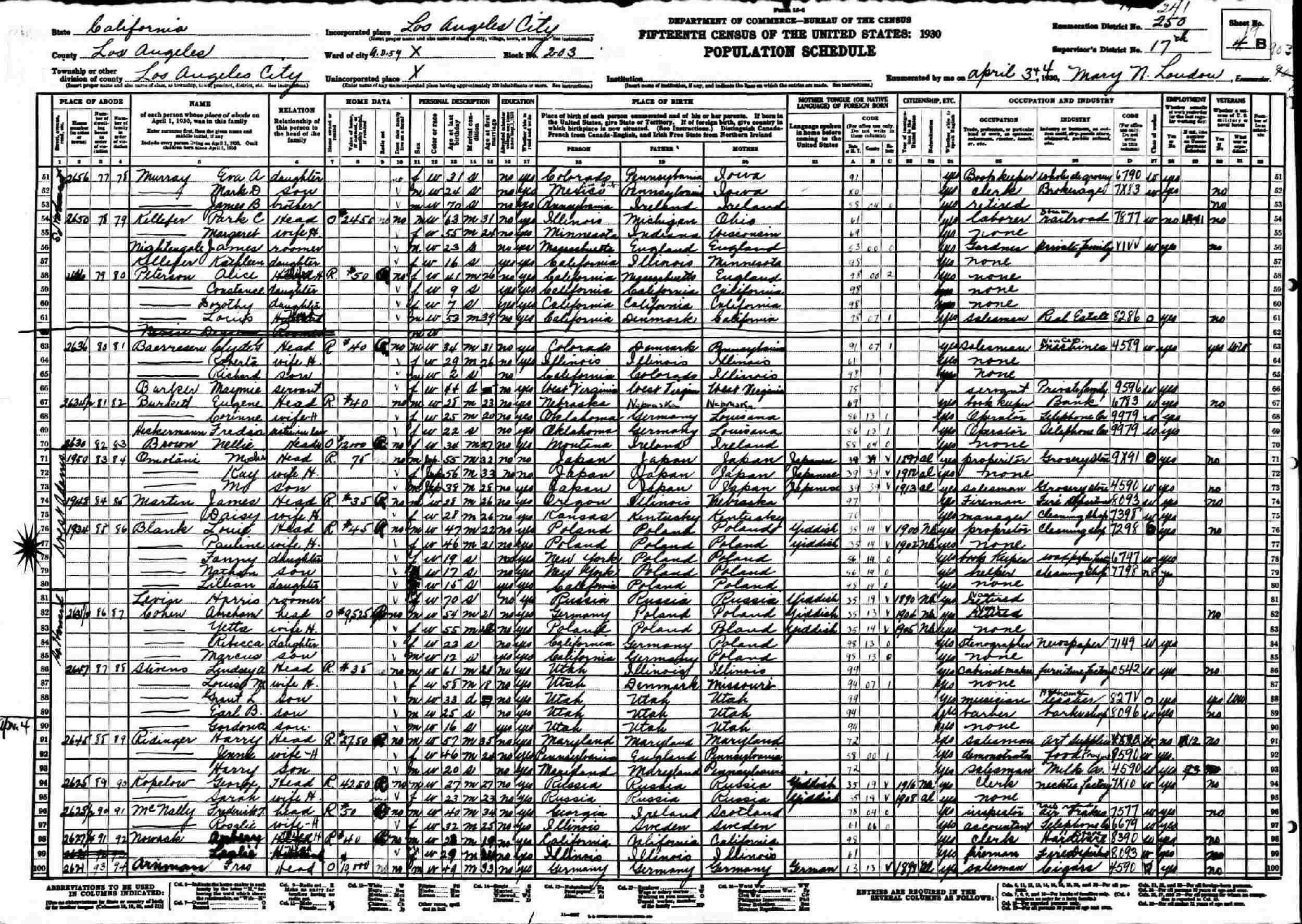 April 3-4, 1930: 194 West Adams, Block 203, Assembly District 59, Supervisor's District 17, Enumeration District 241, Los Angeles, Los Angeles County, California.