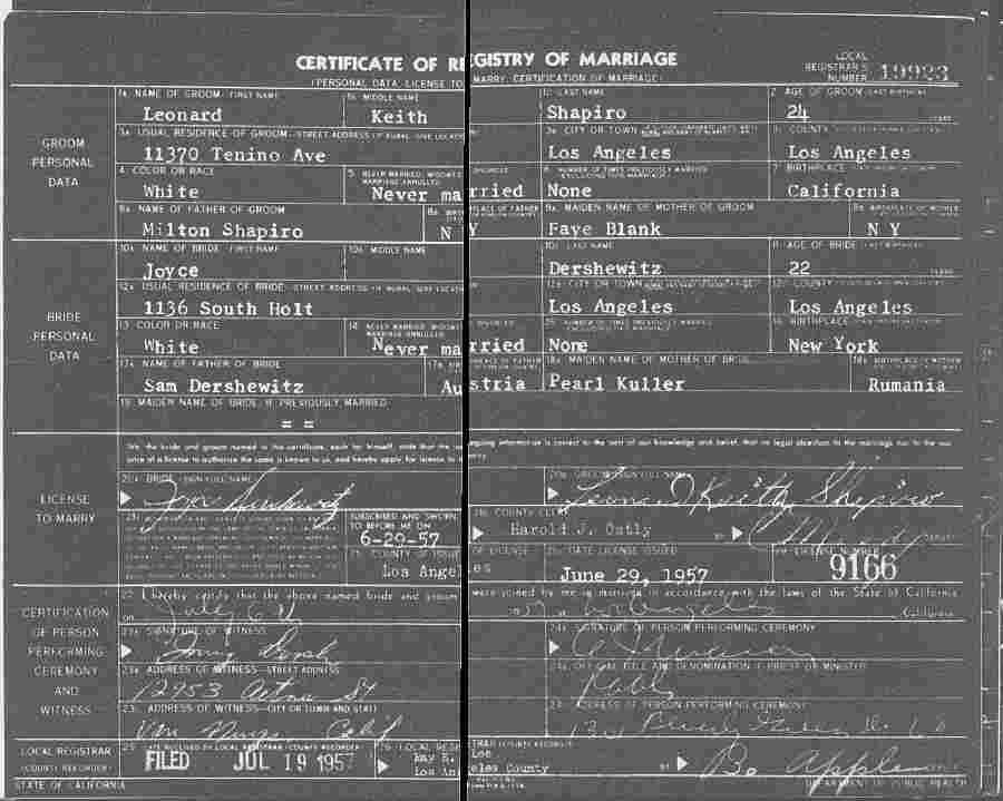 Married: Joyce Dershewitz July 6, 1957 in Los Angeles County, California.