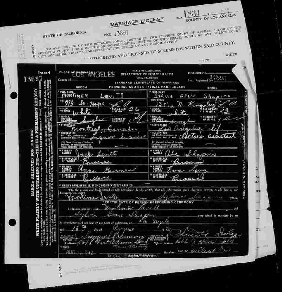 Married: Sylvia Grace Shapiro August 16, 1942 in Los Angeles County, California.