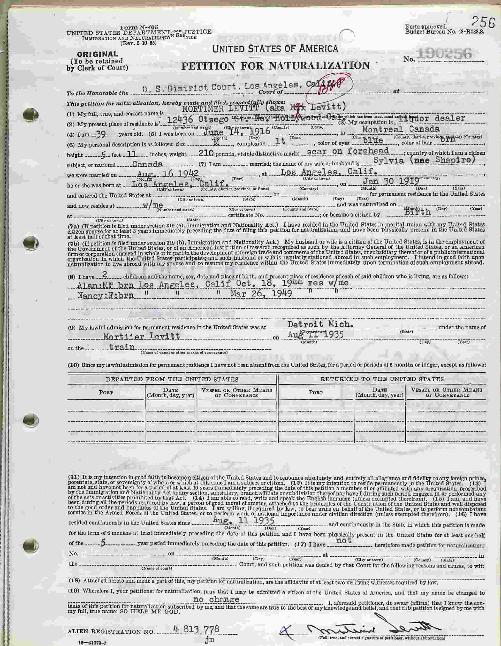 Naturalization: May 4, 1956 - U.S. District Court, Los Angeles, Los Angeles County, California.