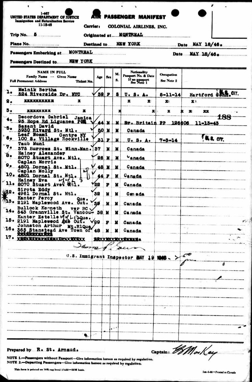 May 18, 1946 - Montreal, Quebec, Canada to New Yorki, New York.