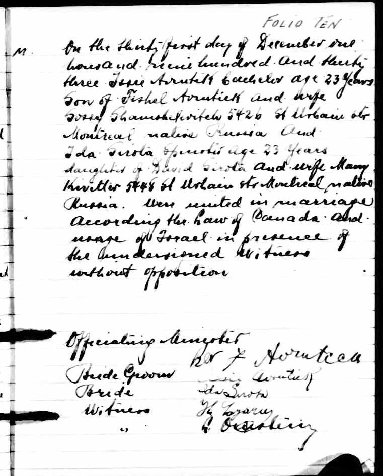Married: Issie Avrutick December 21, 1933 in Jewish Kehal Jeshurun, Montreal, Quebec, Canada.