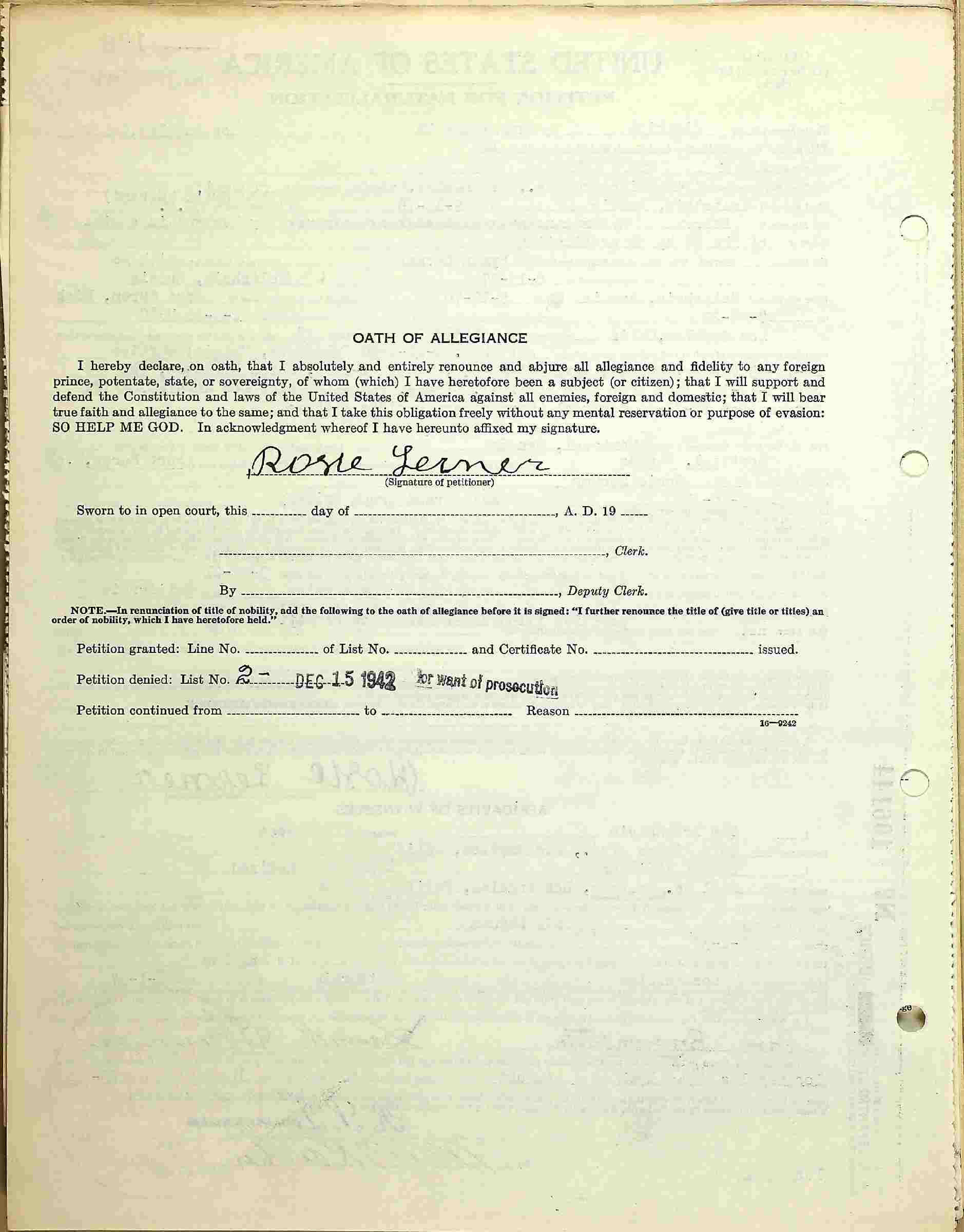 Oath of Allegiance: denied December 15, 1942 for want of prosecution. (NOTE: For what?)