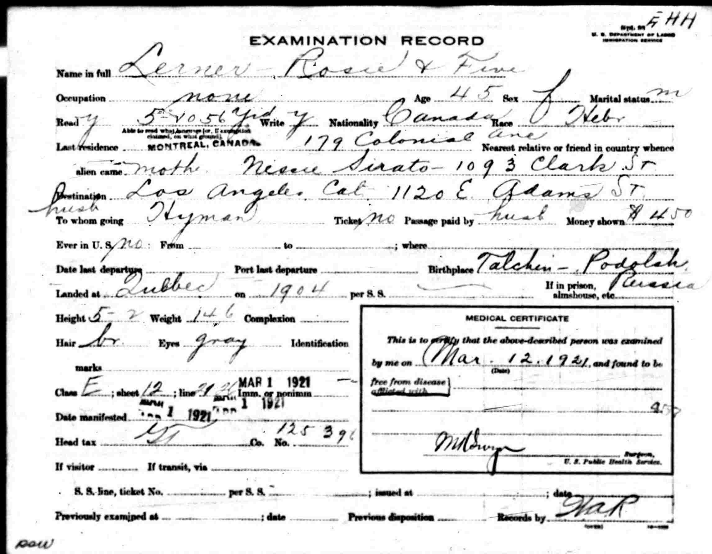 Immigration: March 15, 1921 from Montreal, Canada to Port Huron, Michigan.