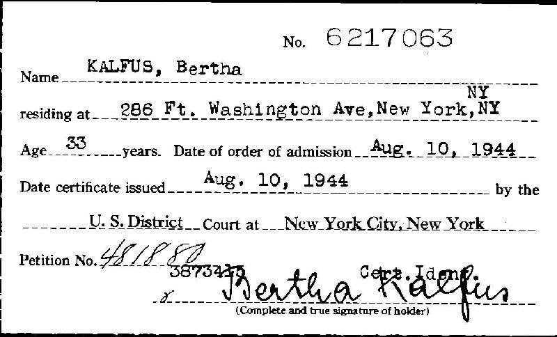 Naturalization: August 10, 1944, U.S. District Court, New York City, New York.