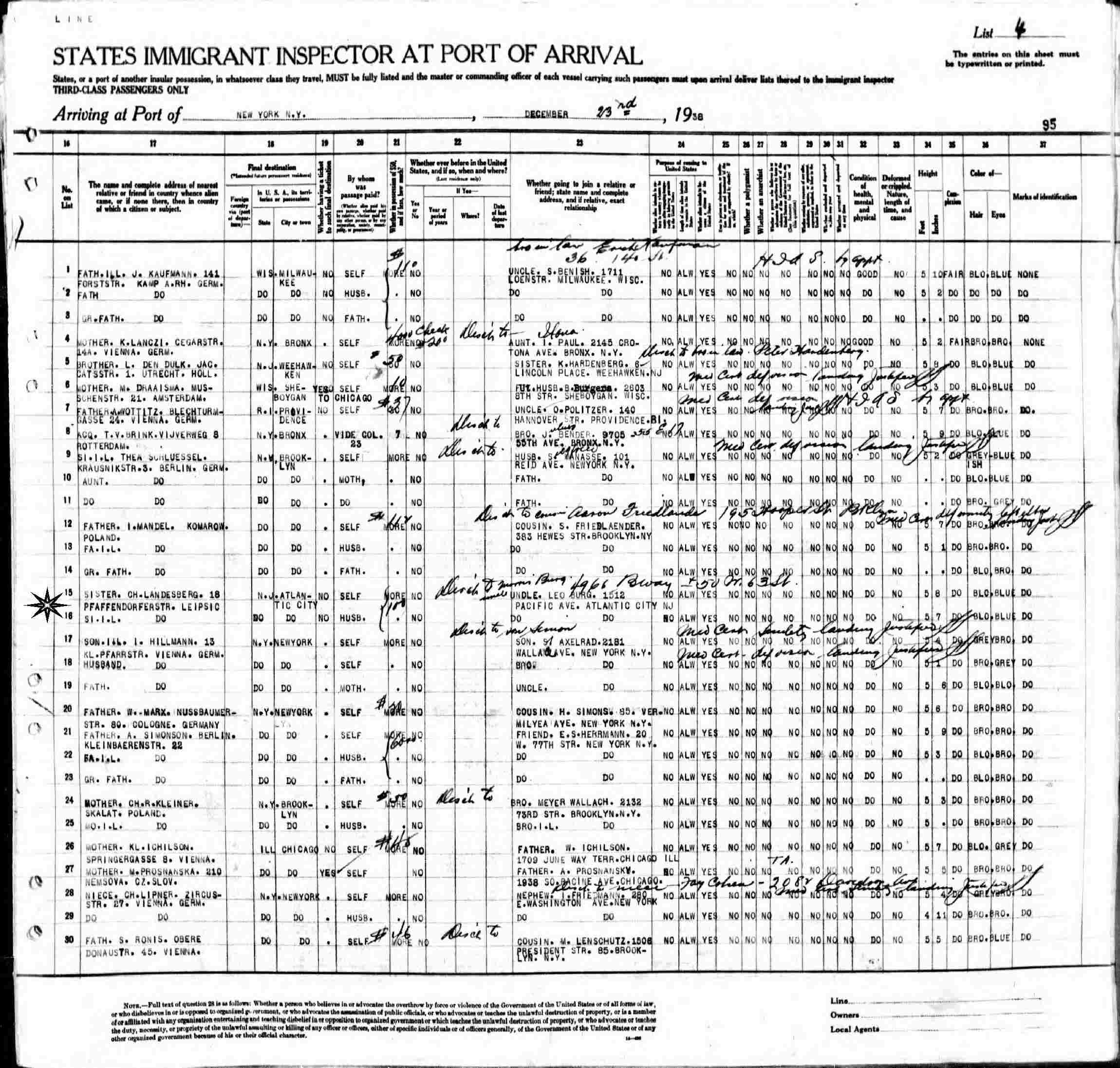 Immigration: December 23, 1938 to Uncle Leo Burg 1512 Pacific Avenue, Atlantic City, New Jersey also on manifest: Dest. to Morris Burg 4966 Broadway, New York.
