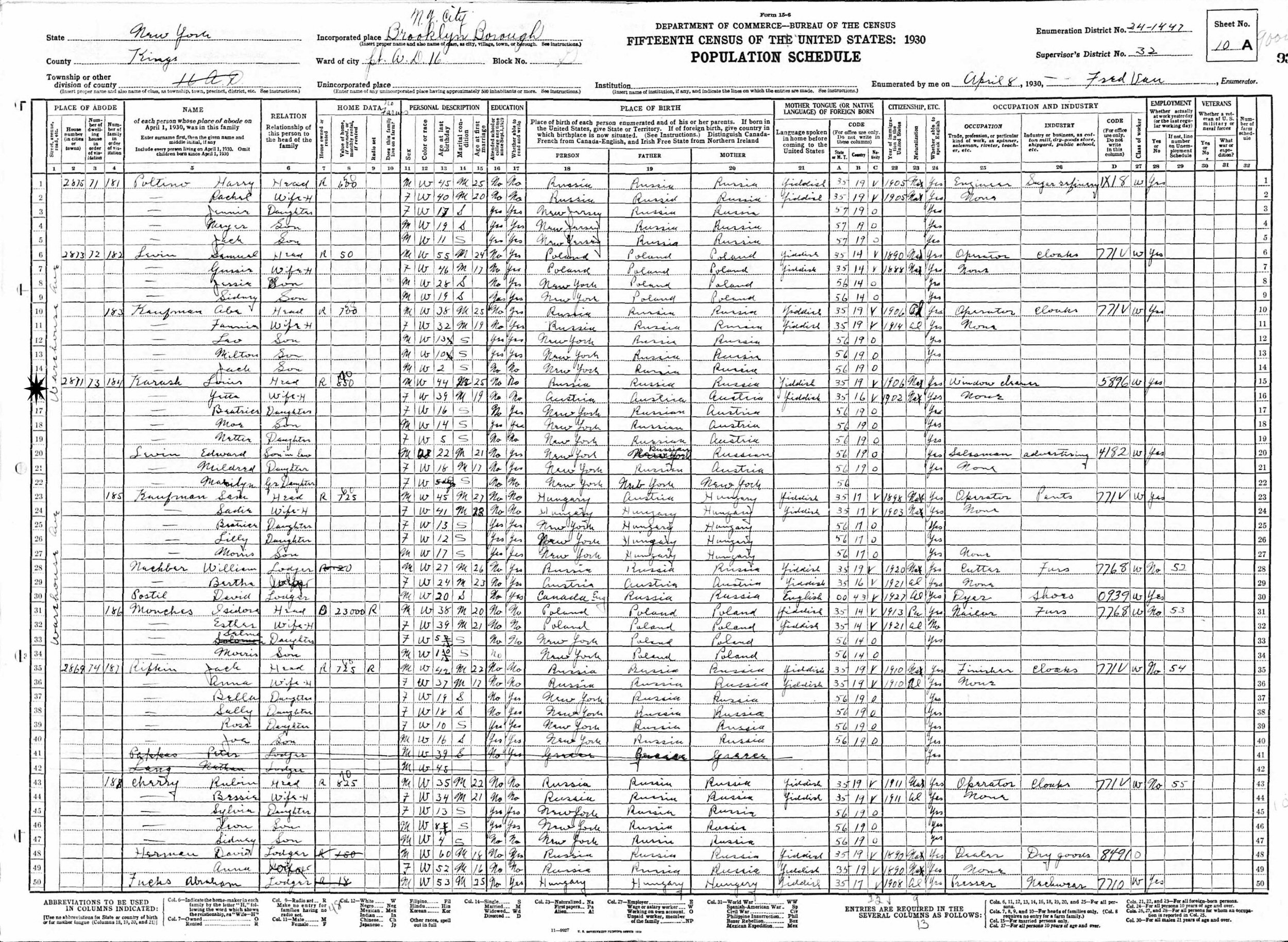 April 8, 1930 - 2871 Warehouse Avenue, Assembly District 16, Block G, Supervisor's District 32, Enumeration District 24-1447, Brooklyn, Kings County, New York.