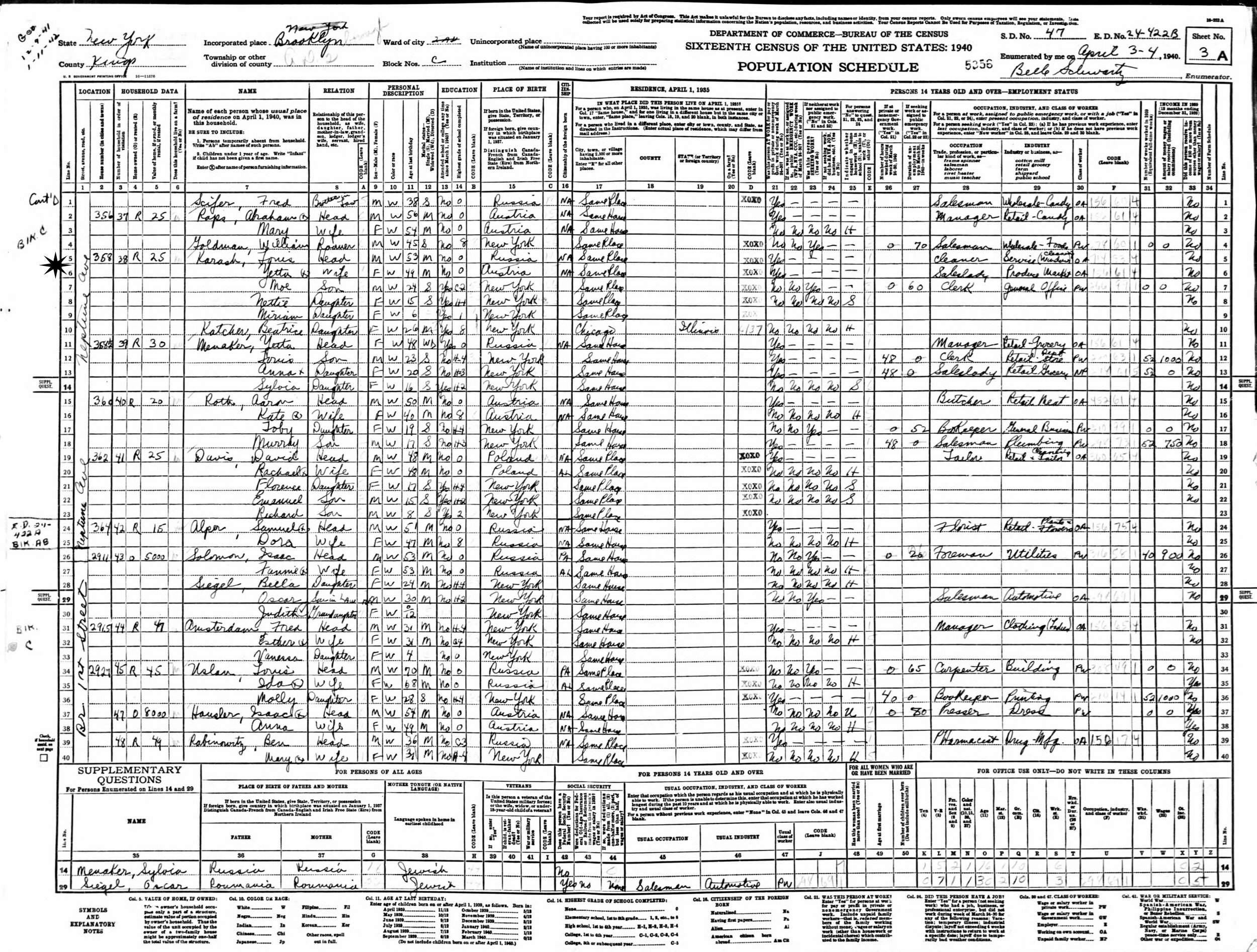 April 3-4, 1940 - 358 Neptune Avenue, Assembly District 2, Block C, Supervisor's District 47, Enumeration District 24-422B, Brooklyn, Kings County, New York.