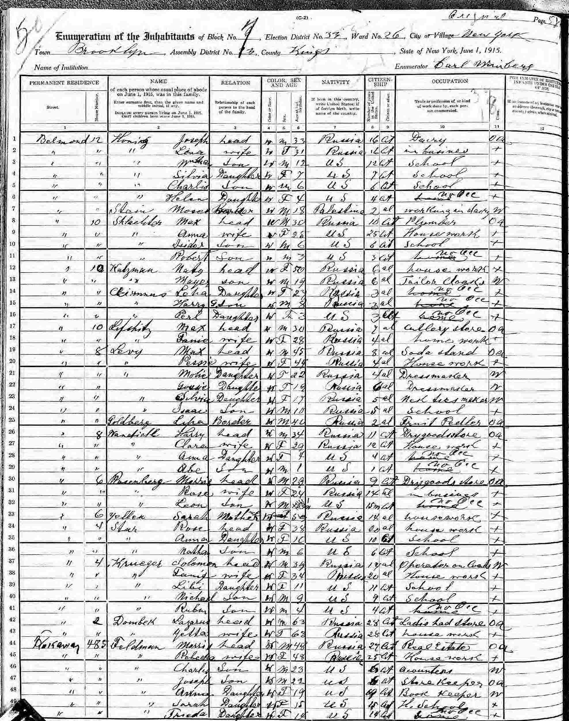 June 1, 1915 - New York State - 10 Belmond, Block 6, Election District 33, Assembly District 23, Brooklyn, Kings County, New York.