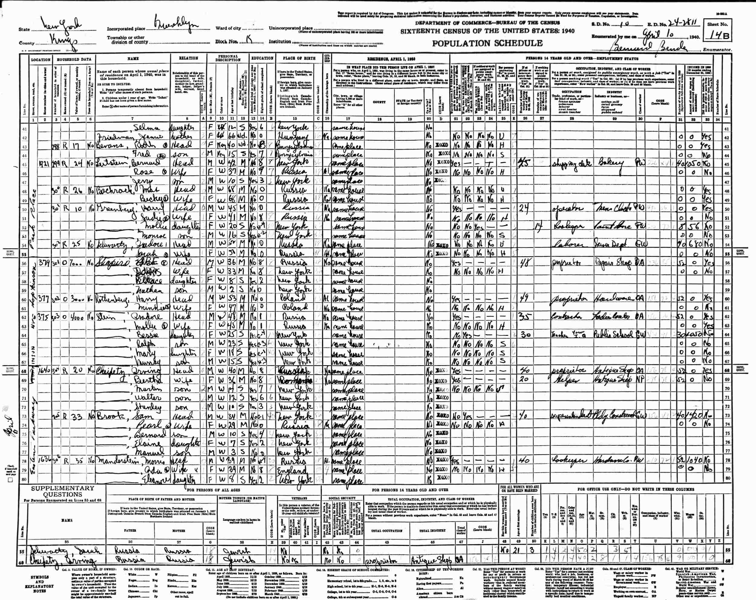 April 10, 1940 - 1640 Eastern Parkway, Block K, Supervisor's District 10, Enumeration District 24-2811, Brooklyn, Kings County, New York.