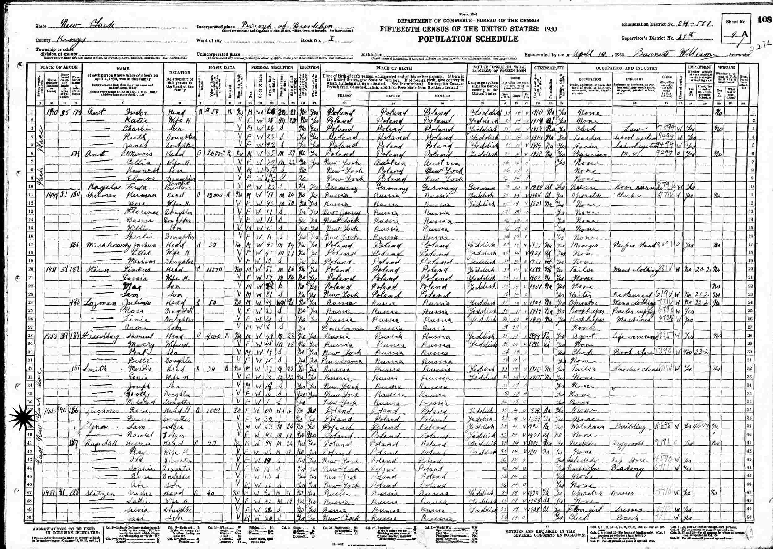 April 19, 1930 - 1455 East New York Avenue, Block I, Supervisor's District 29, Enumeration District 24-587, Brooklyn, Kings County, New York.