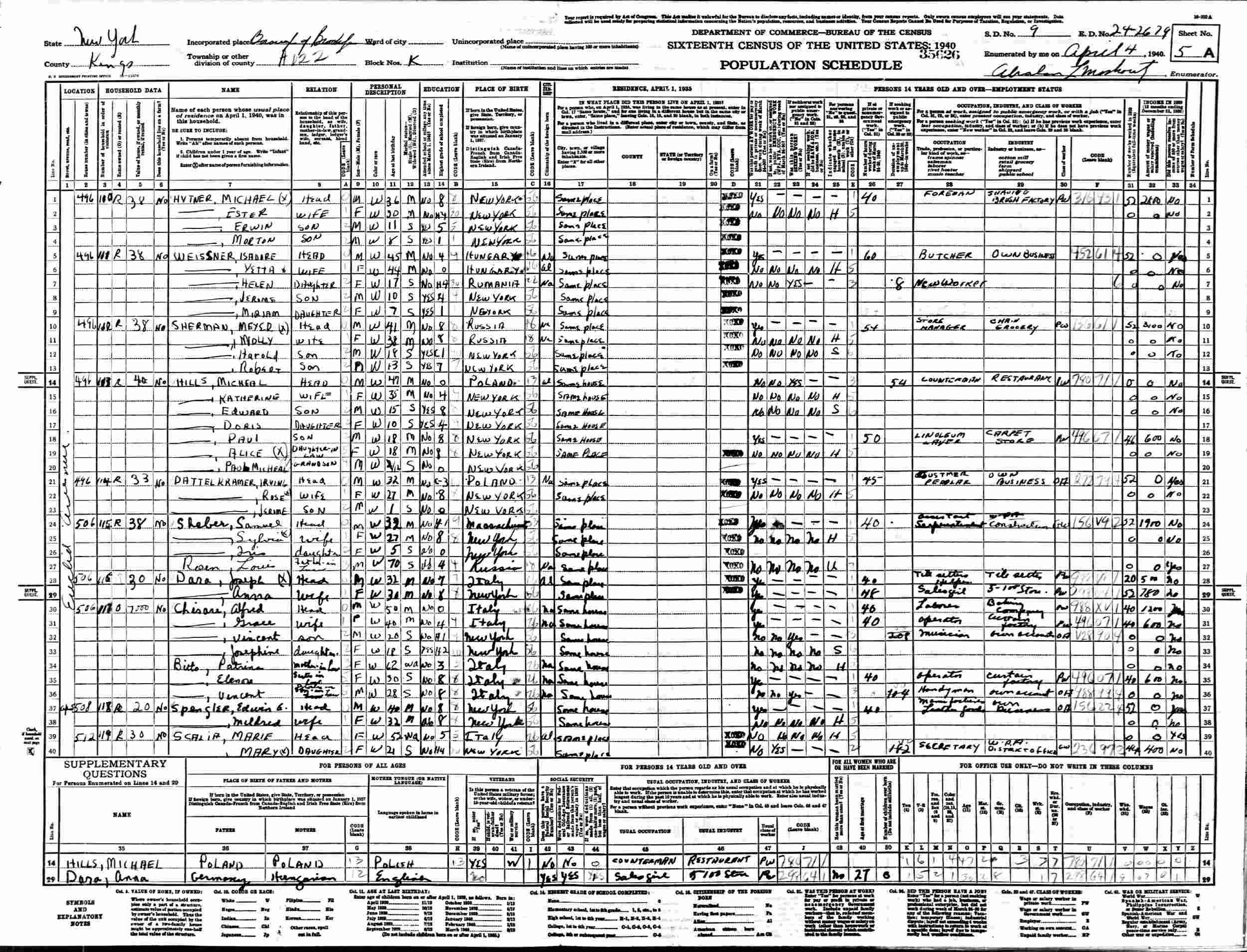 April 4, 1940 - 506 Euclid Avenue, Assembly District 22, Block K, Supervisor's District 9, Enumeration District 24-2679, Brooklyn, Kings County, New York.
