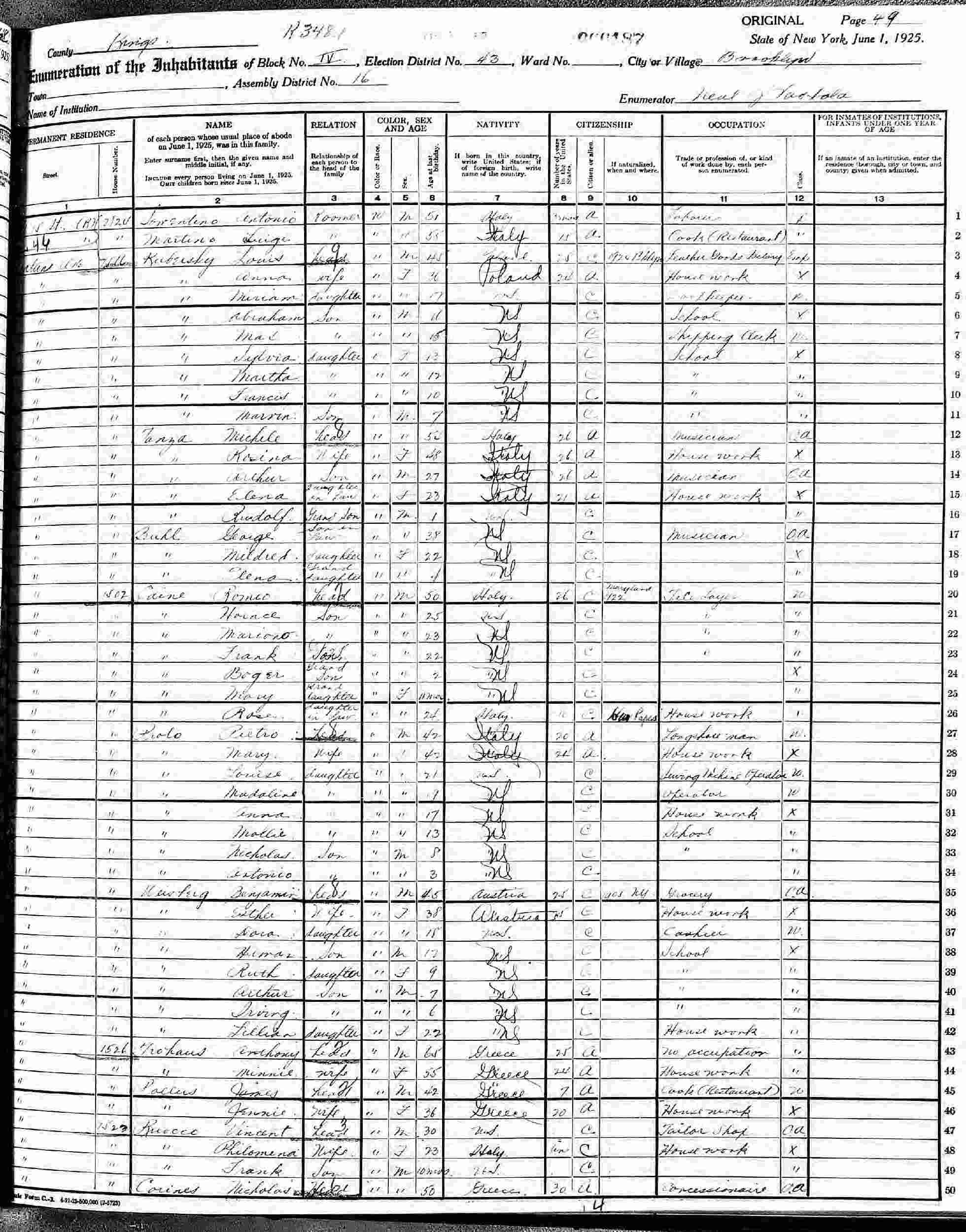 June 1, 1925 - New York State - 2516 Neptune Avenue, Block 4, Election District 43, Assembly District 16, Brooklyn, Kings County, New York.