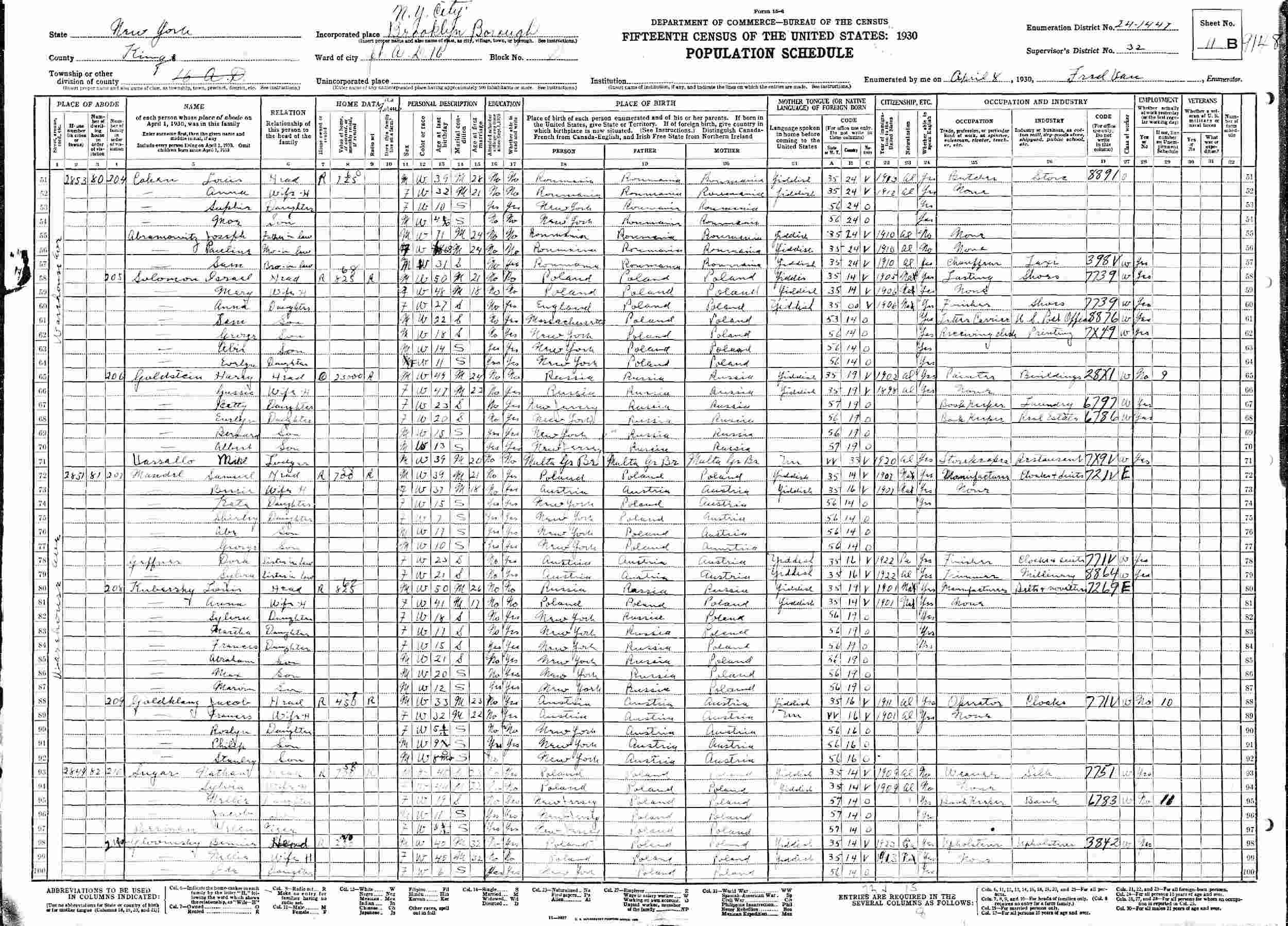 April 8, 1930 - 2851 Warehouse Avenue, Assembly District 16, Block D, Supervisor's District 32, Enumeration District 24-1447, Brooklyn, Kings County, New York.