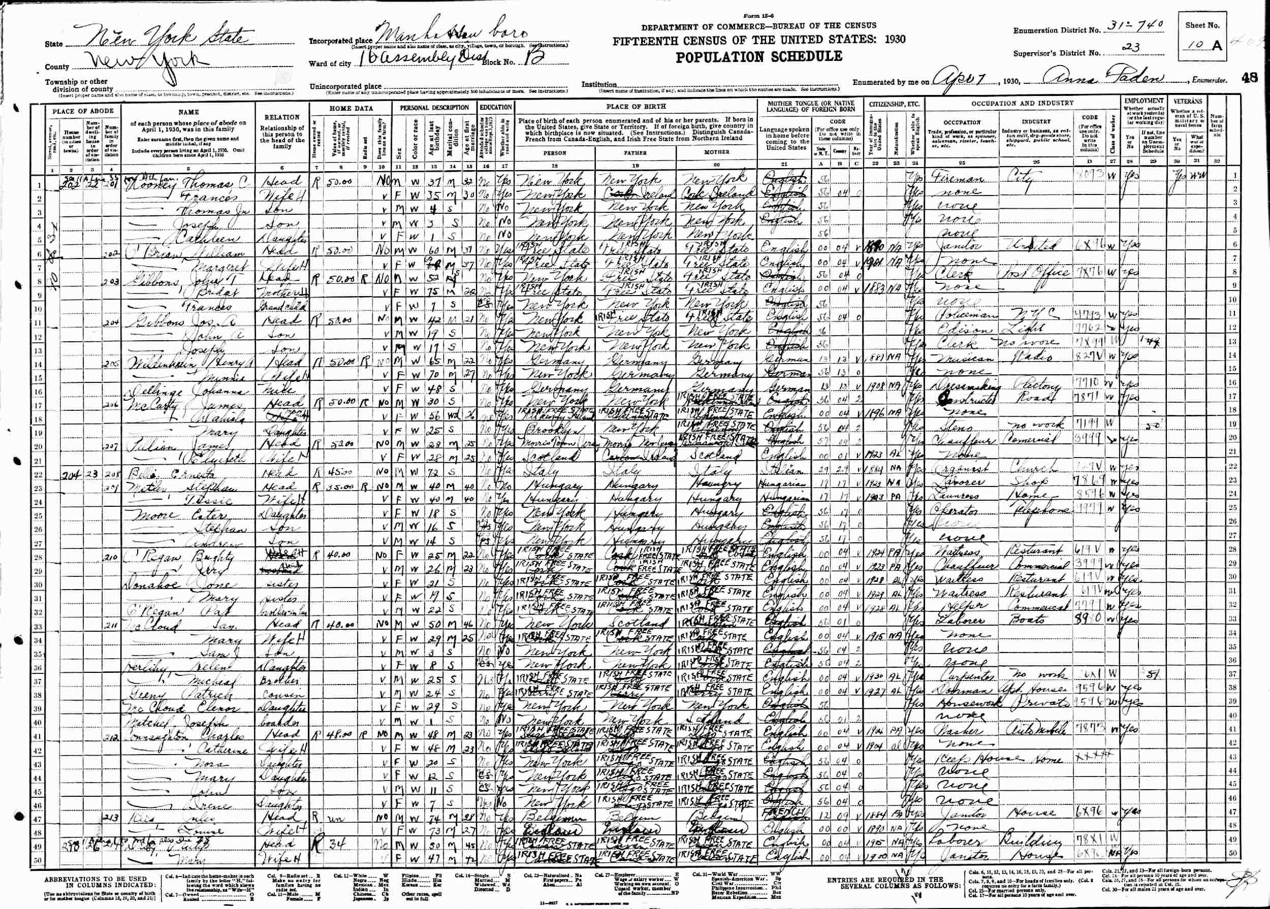 April 7, 1930 - 202 90th Street, Block B, Assembly District 16, Supervisor's District 23, Enumeration District 31-740, Manhattan, New York.