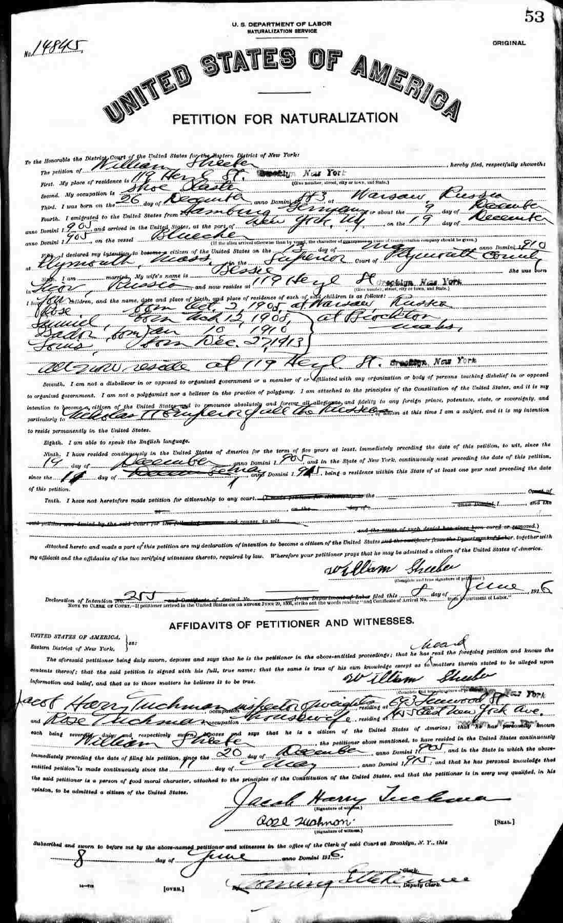 Petition For Naturalization: June 8, 1916.