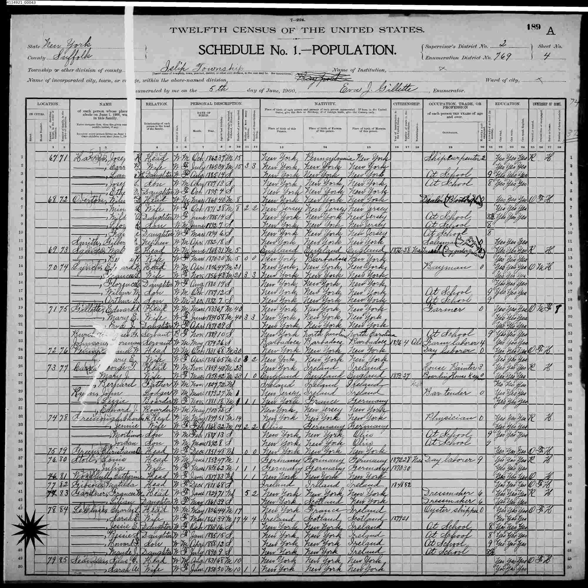 jUNE 5, 1900 - ED 769, Islip Township Election District 6, Suffolk County, Long Island, New York.