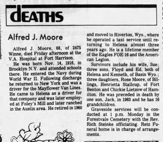 Died: October 11, 1985 in Veterans Administration Hospital, Fort Harrison, Lewis and Clark County, Montana.