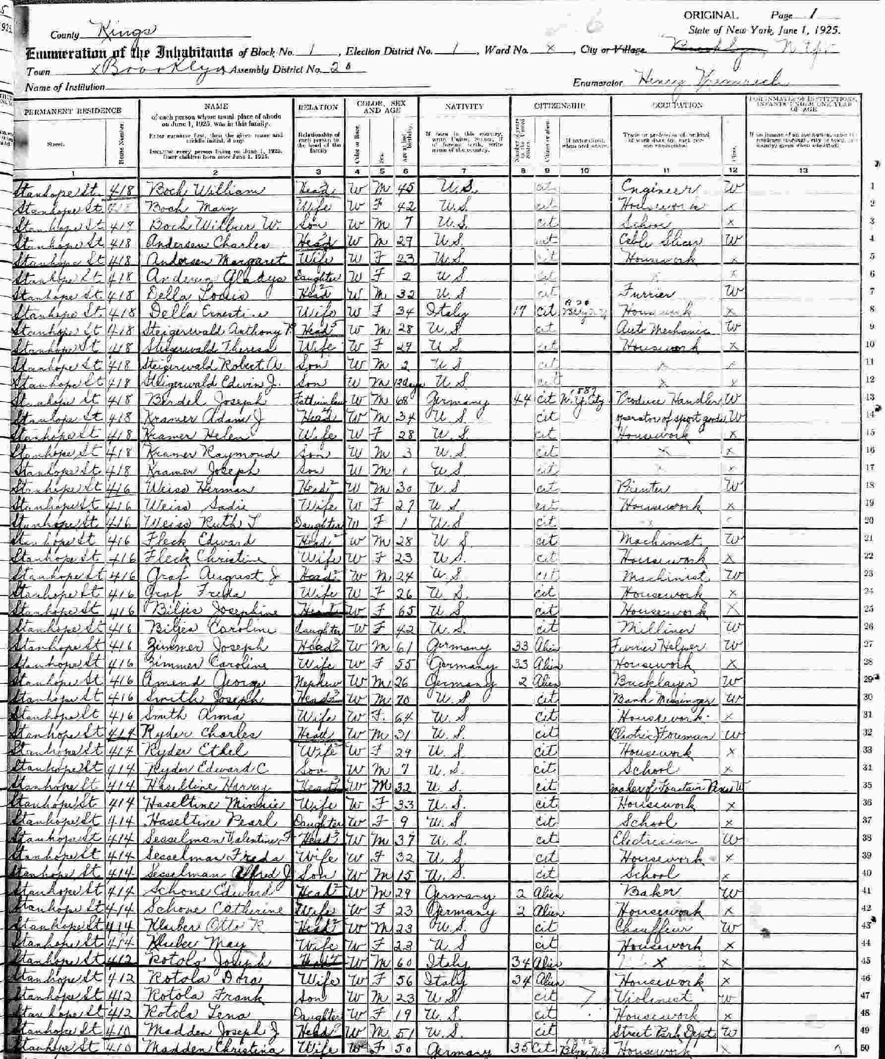 June 1, 1925 - New York State : 416 Stanhope Street, Block 1, Assembly District 20, Election District 1, Brooklyn, Kings County, New York.