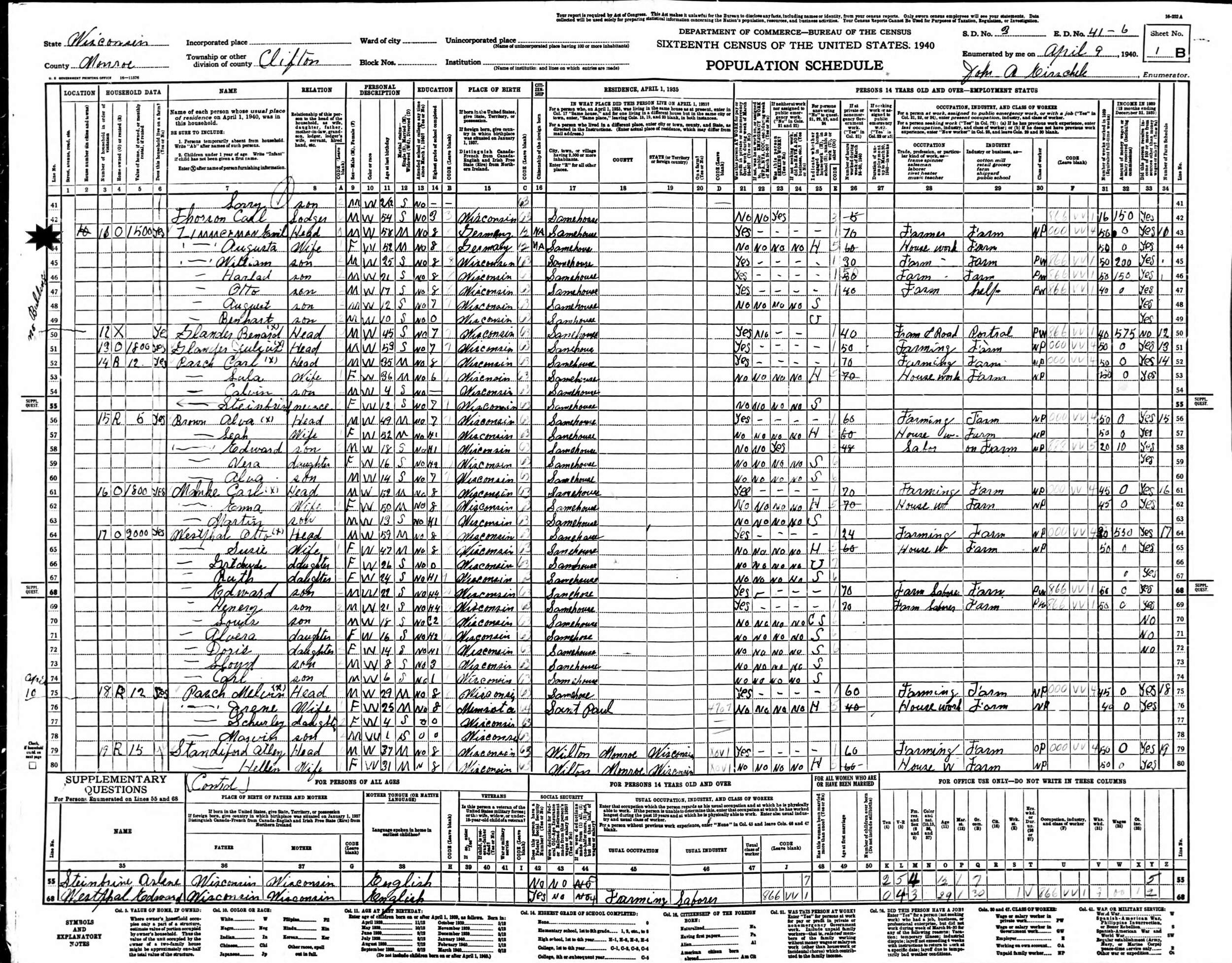 APril 9, 1940 - Supervisor's District 3, Enumeration District 41-6, Clinton, Monroe County, Wisconsin.