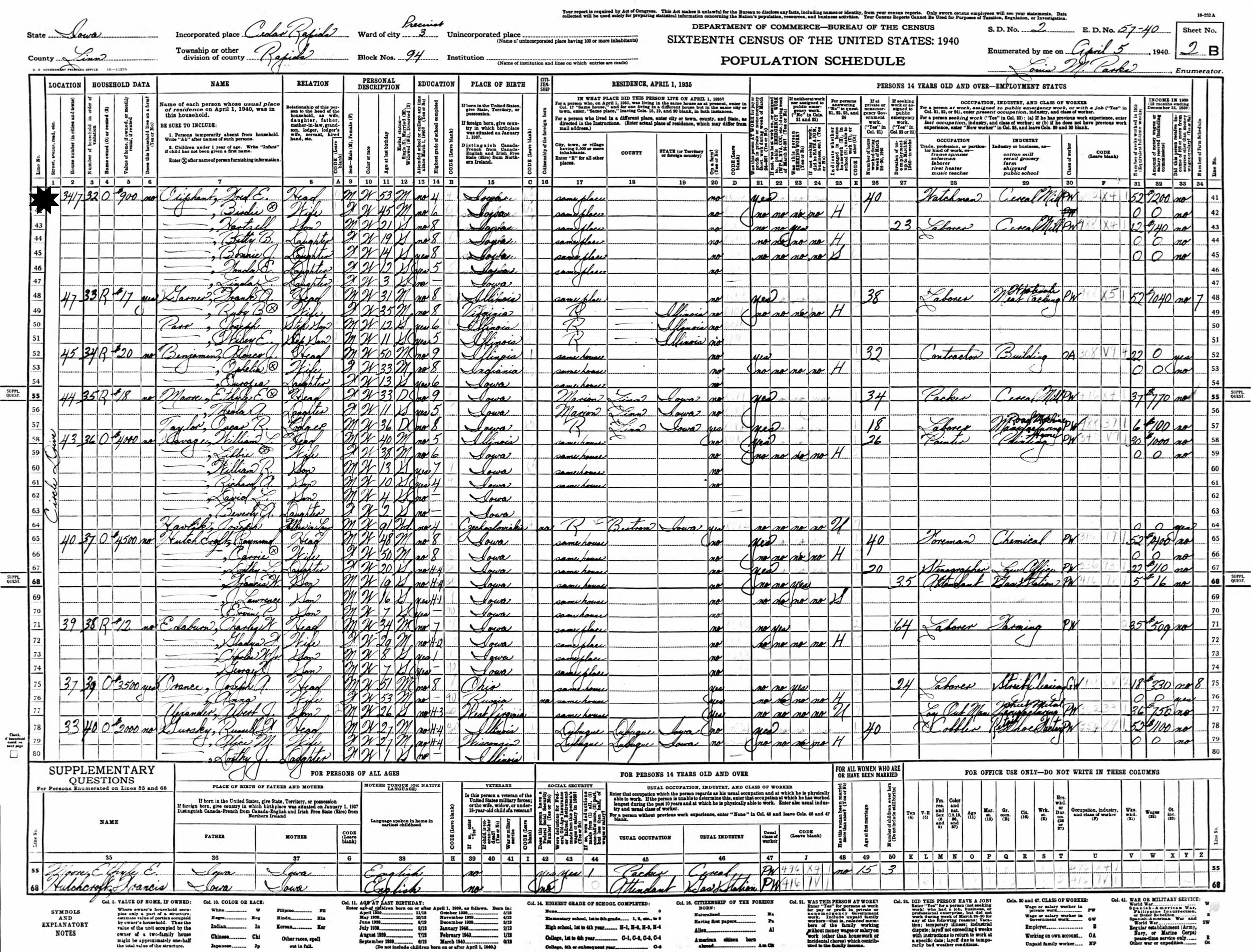 April 5, 1940 - 3417 Circle Drive, Precinct 3, Block 94, Supervisor's Distirct 2, Enumeration District 57-30, Rapids, Cedar Rapids, Linn County, Iowa.