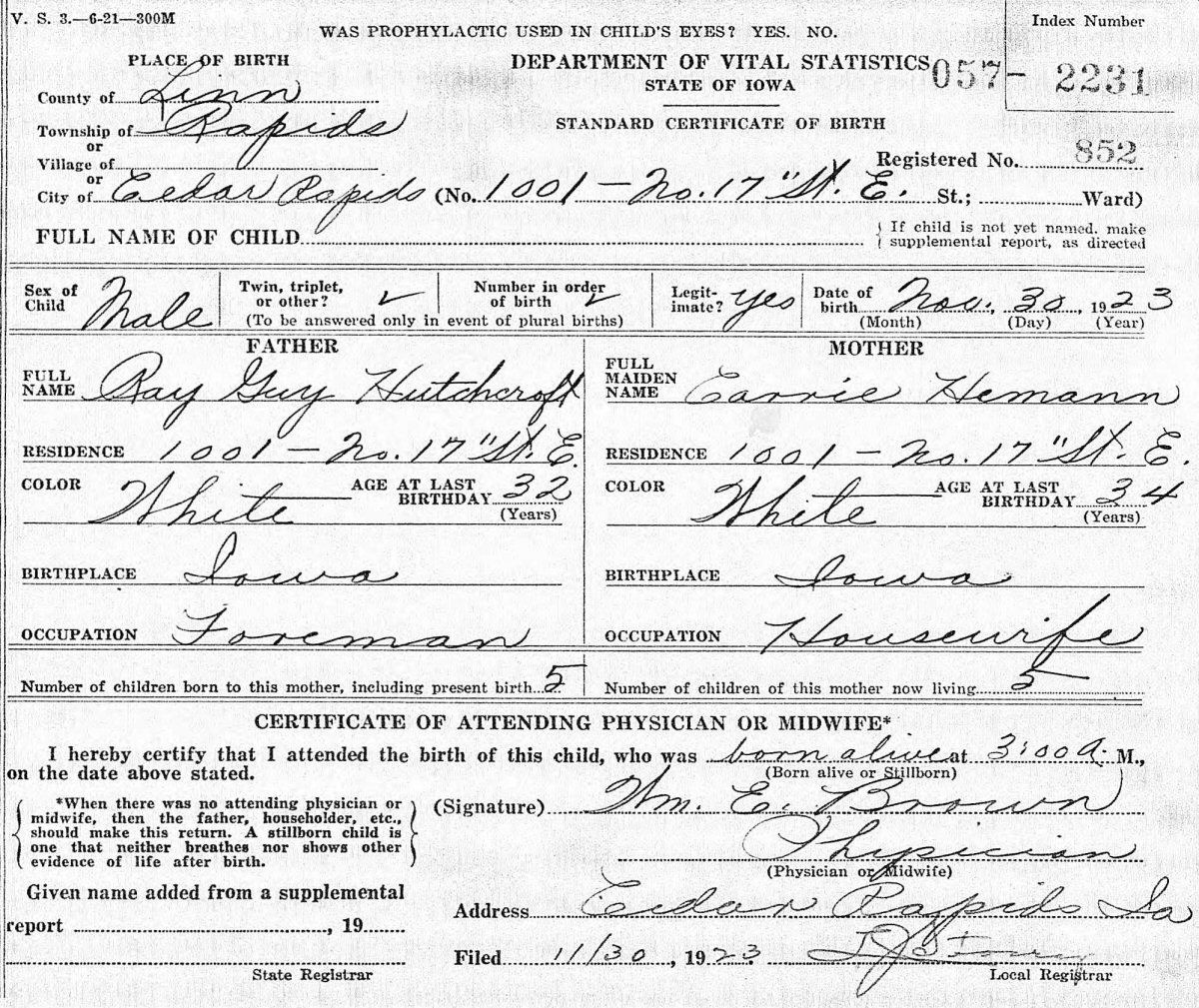 Born: August 3, 1925 in Washington Township, Center Point, Linn County, Iowa. (Birth Certificate: #513373.)