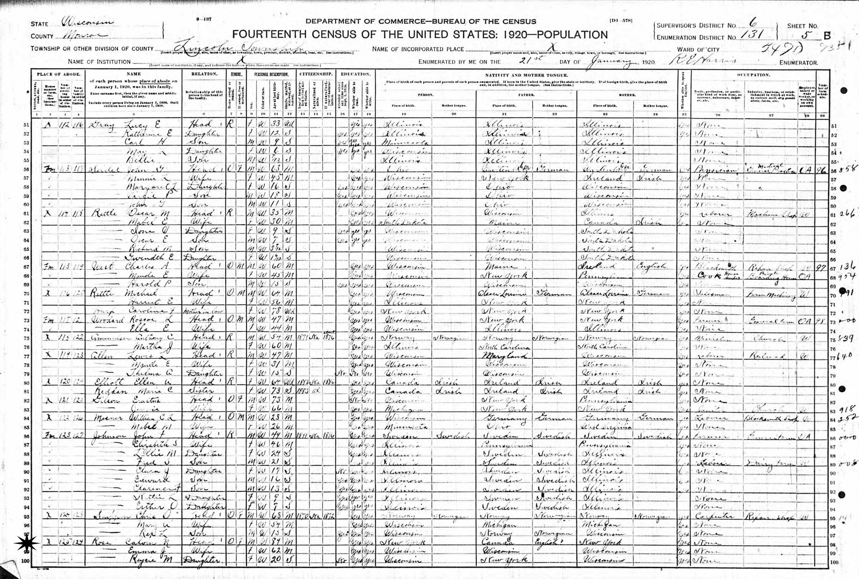 January 21, 1920 - Supervisor's District 6, Enumeration District 131, Lincoln Township, Monroe County, Wisconsin.