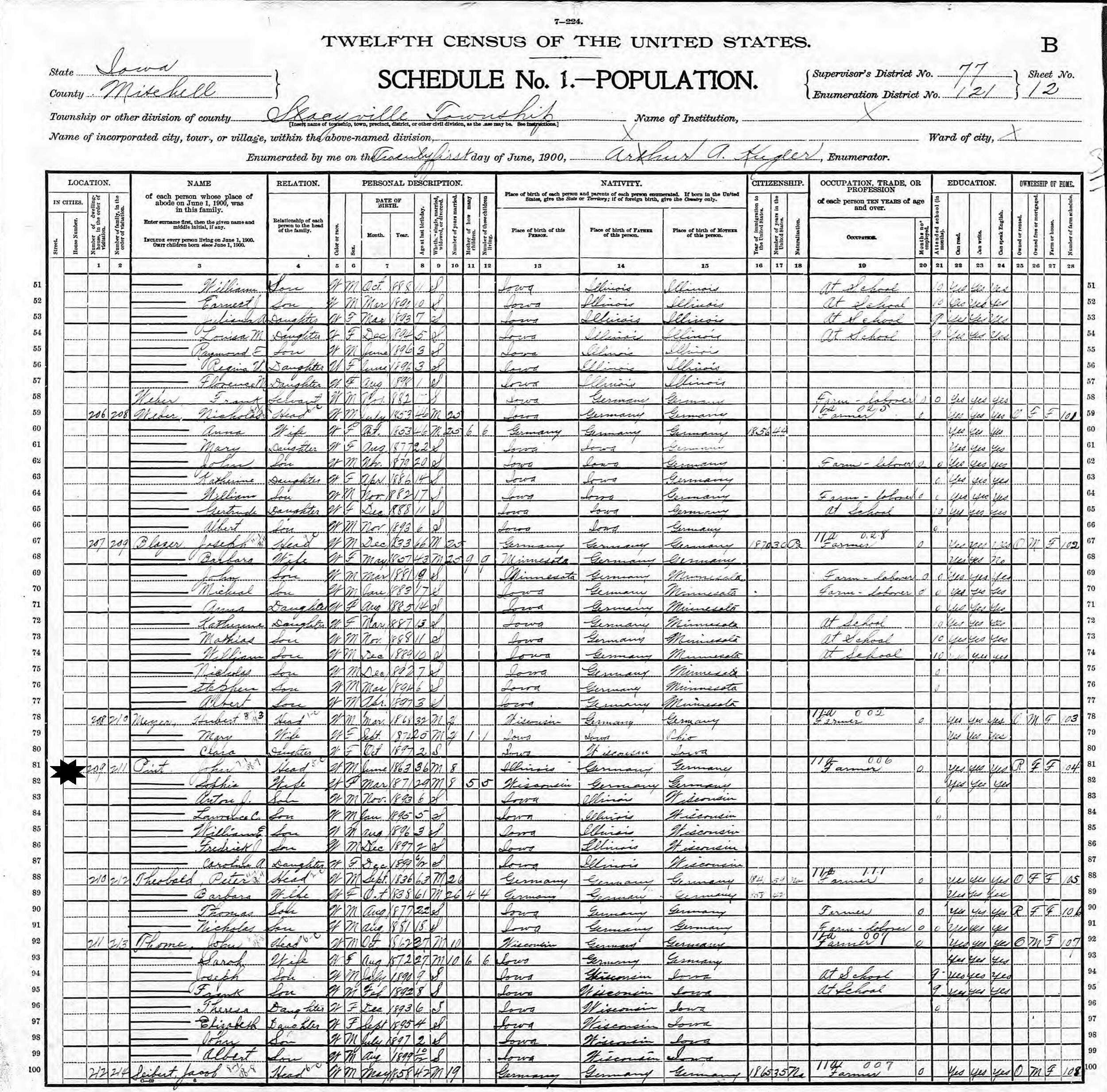 June 21, 1900 - Supervisor's District 77, Enumeration District 121, Stacyville Township, Mitchell County, Iowa.