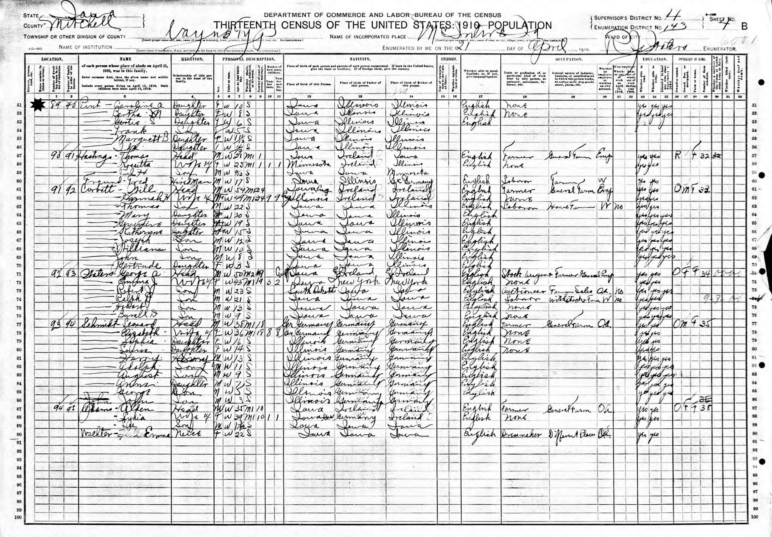 April 19, 1910 - Supervisor's District 4, Enumeration District 143, Wayne, McIntire, Mitchell County, Iowa.