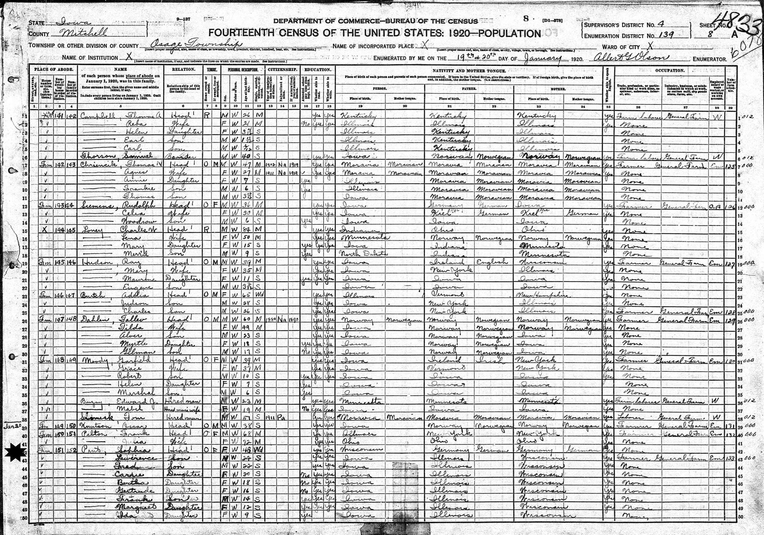 January 19-20, 1920 - Farm, Supervisor's District 4, Enumeration District 139, Osage Township, Mitchell County, Iowa.