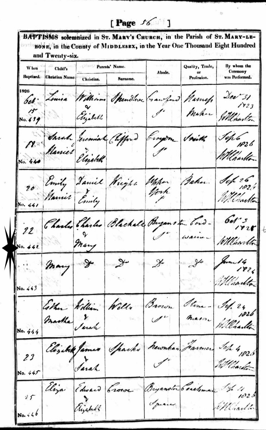 Baptism: October, 1826 in St. Mary's Church, Bryanston Square, St. Mary-Le-Bone, Westminster, London, Middlesex, England.