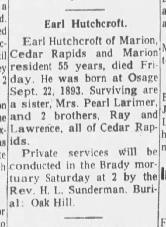 Buried: July 25, 1959 in Oak Hill Cemetery, Cedar Rapids, Linn County, Iowa.