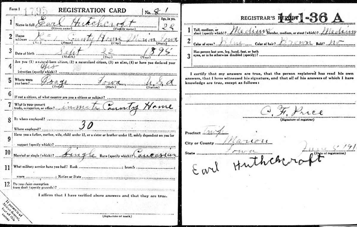 June 5, 1917 - Inmate of County Home, Marion, Linn County, Iowa.