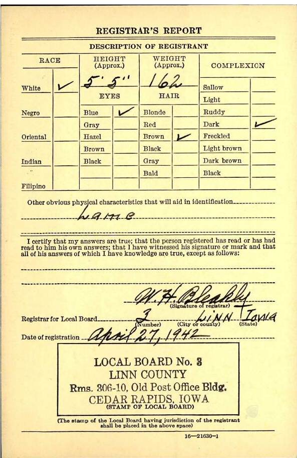 Alternate Place of Birth: Cedar Rapids, Linn County, Iowa. (WWII Draft Registration Card.)